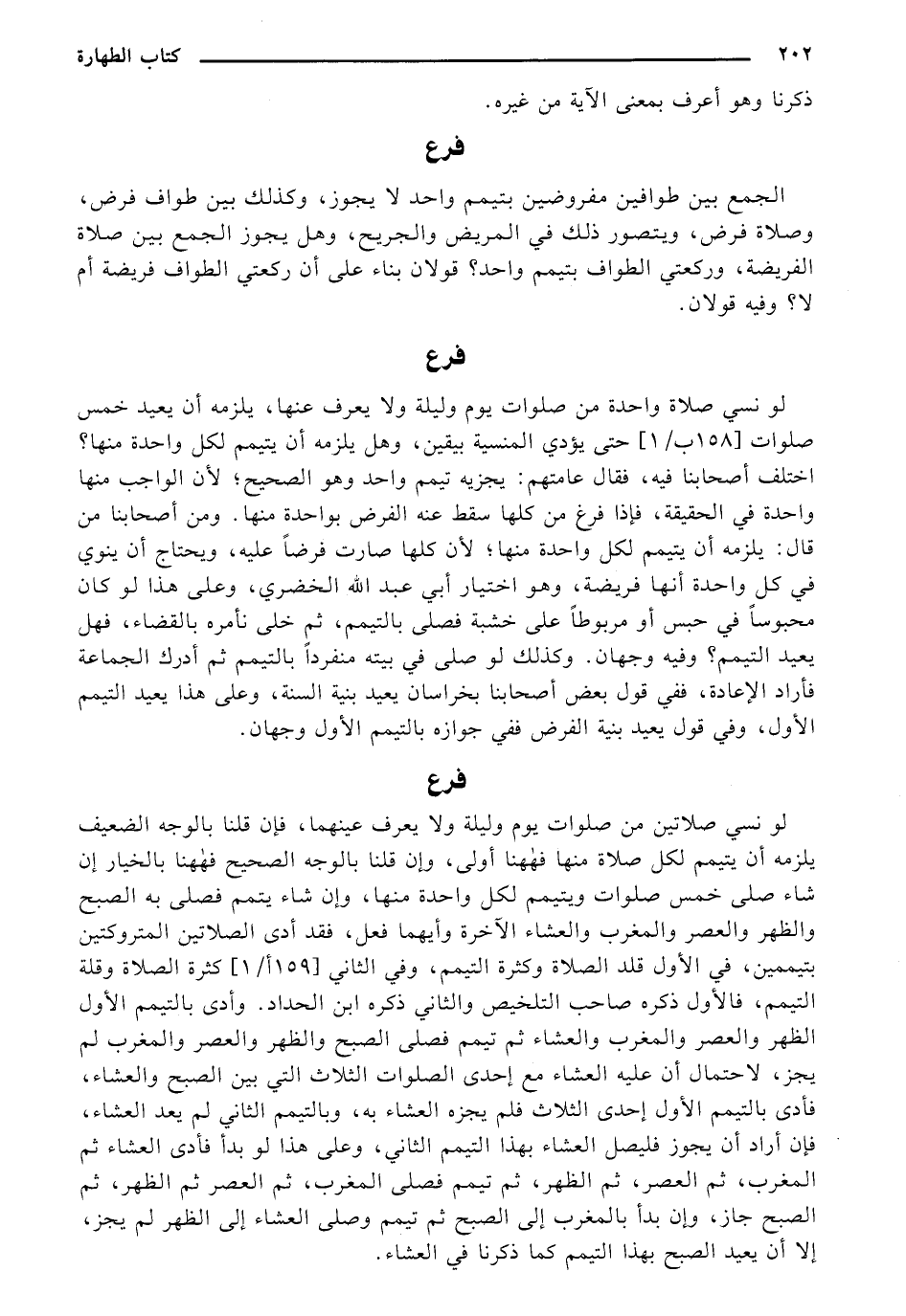 لو نسي صلاتين من صلوات يوم وليلة ولا يعرف عينهما, فإن قلنا بالوجه الضعيف يلزمه أن يتيمم لكل صلاة منها فهاهنا أولى, وإن قلنا بالوجه الصحيح هاهنا بالخيار إن شاء صلى خمس صلوات ويتيمم لكل واحدة منها, وإن شاء يتمم فصلى به الصبح والظهر والعصر والمغرب والعشاء الآخرة وأيهما فعل, فقد أدى الصلاتين المتروكتين بتيممين, في الأول قلد الصلاة وكثرة التيمم, وفي الثاني [159 ب/1] كثرة الصلاة وقلة التيمم, فالأول ذكره صاحب التلخيص والثاني والثاني ذكره ابن الحداد. وأدى بالتيمم الأول الظهر والعصر والمغرب والعشاء ثم تيمم فصلى الصبح والظهر والعصر والمغرب لم يجز, لاحتمال أن عليه العشاء مع إحدى الصلوات الثلاث التي بين الصبح والعشاء, فأدى بالتيمم الأول إحدى الثلاث فلم يجزه العشاء به, وبالتيمم الثاني لم يعد العشاء, فإن أراد أن يجوز فليصل العشاء بهذا التيمم الثاني, وعلى هذا لو بدأ فأدى العشاء ثم المغرب, ثم العصر, ثم الظهر, ثم تيمم فصلى المغرب, ثم العصر ثم الظهر, ثم الصبح جاز, وإن بدأ بالمغرب إلى الصبح ثم تيمم وصلى العشاء إلى الظهر لم يجز, إلا أن يعيد الصبح بهذا التيمم كما ذكرنا في العشاء.