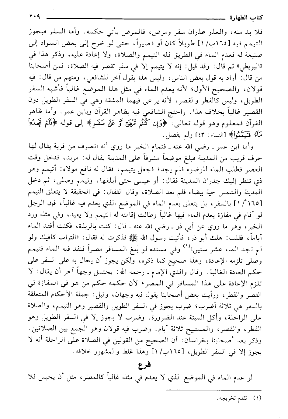 فلا بد منه، والعذر عذران سفر ومرض، فالمرض يأتي حكمه. وأما السفر فيجوز التيمم فيه [165 أ/ 1] طويلاً كان أو قصيراً، حتى لو خرج إلى بعض السواد إلى صنيعة له فعدم الماء في الطريق فله التيمم والصلاة، ولا إعادة عليه، وذكر هذا في ((البويطي)) ثم قال: وقد قيل: إنه لا يتيمم إلا في سفر تقصر فيه الصلاة، فمن أصحابنا من قال: أراد به قول بعض الناس، وليس هذا بقول آخر للشافعي، ومنهم من قال: فيه قولان، والصحيح الأول، لأنه يعدم الماء في مثل هذا الموضع غالباً فأشبه السفر الطويل، وليس كالفطر والقصر، لأنه يراعى فيهما المشقة وهي في السفر الطويل دون القصير غالباً بخلاف هذا. واحتج الشافعي