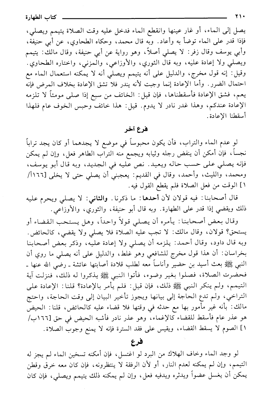 يصل إلى الماء، أو غار عينها وانقطع الماء فدخل عليه وقت الصلاة يتيمم ويصلي، فإذا قدر على الماء توضأ به وأعاد. وبه قال محمد، وحكاه الطحاوي، عن أبي حنيفة، وأبي يوسف وقال زفر: لا يصلي أصلاً، وهو رواية عن أبي حنيفة، وقال مالك: يتيمم ويصلي ولا إعادة عليه، وبه قال الثوري، والأوزاعي، والمزني، واختاره الطحاوي. وقيل: إنه قول مخرج،