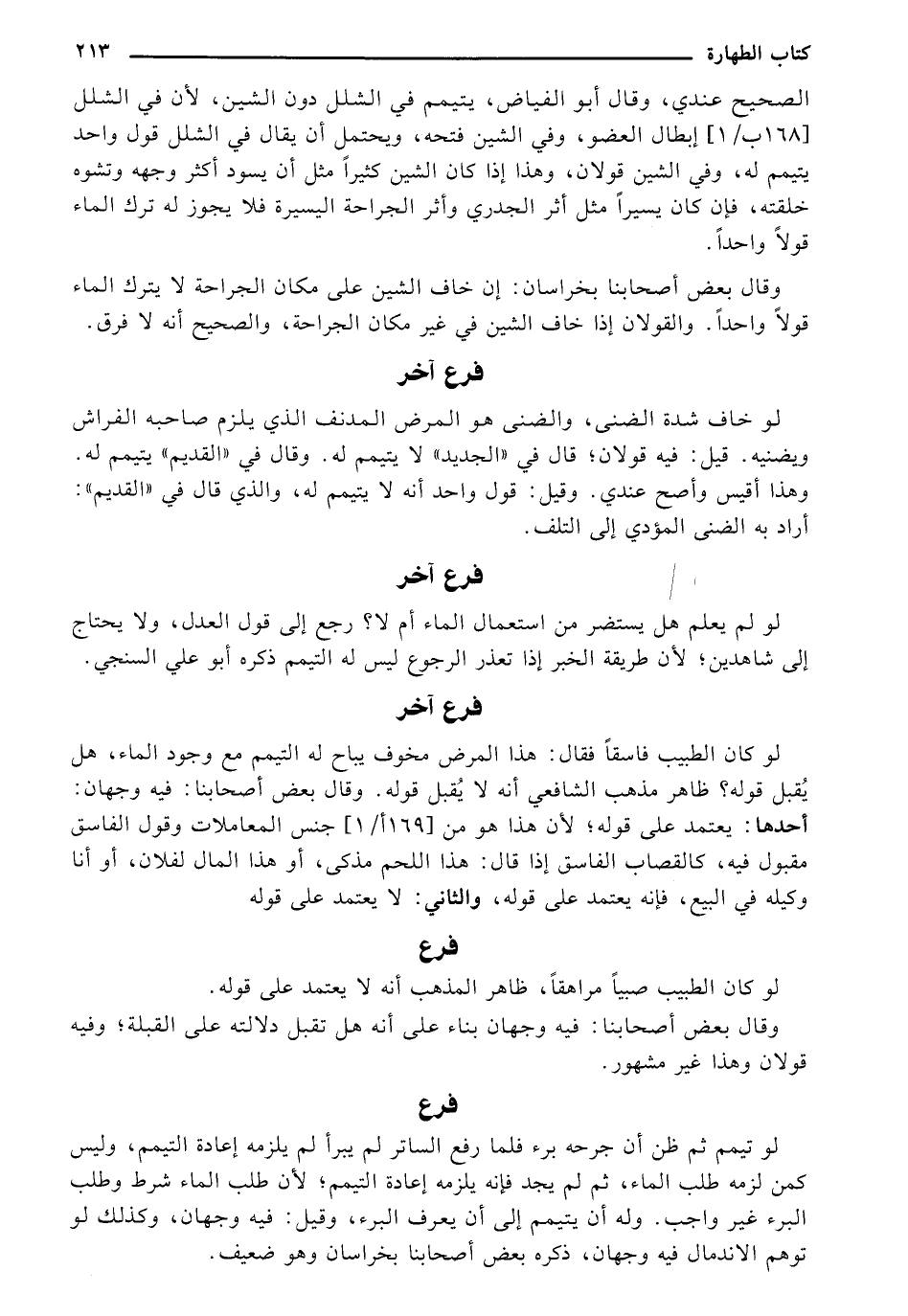الصحيح عندي، وقال أبو الفياض، يتيم في الشلل دون الشين، لأن في الشلل [169 أ/ 1] إبطال العضو، وفي الشين فتحه، ويحتمل أن يقال في الشلل قول وحد يتيم له، وفي الشين قولان، وهذا إذا كان الشين كثيراً مثل أن يسود أكثر وجهه وتشوه خلقته، فإن كان يسيراً مثل أثر الجدري وأثر الجراحة اليسيرة فلا يجوز له ترك الماء قولاً واحداً.