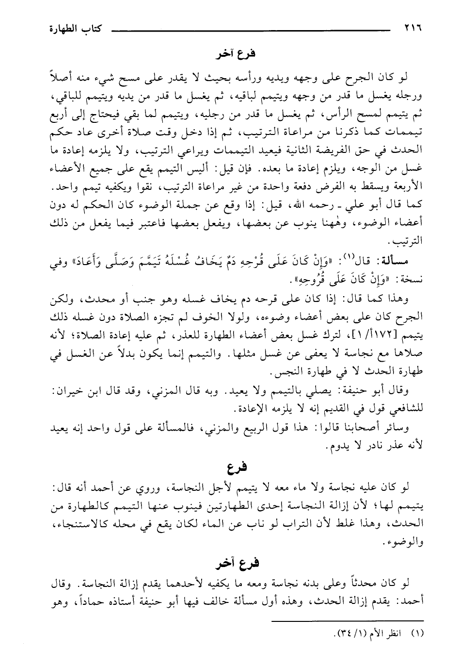 مسألة: قال: "وَإِنْ كَانَ عَلَى قُرْحِهِ دًمُ يَخَافُ غُسْلَهُ تَيَمٌمَ وَصَلَ وَأَعَادَ" وفي نسخة: "وإن كان على قروحه".