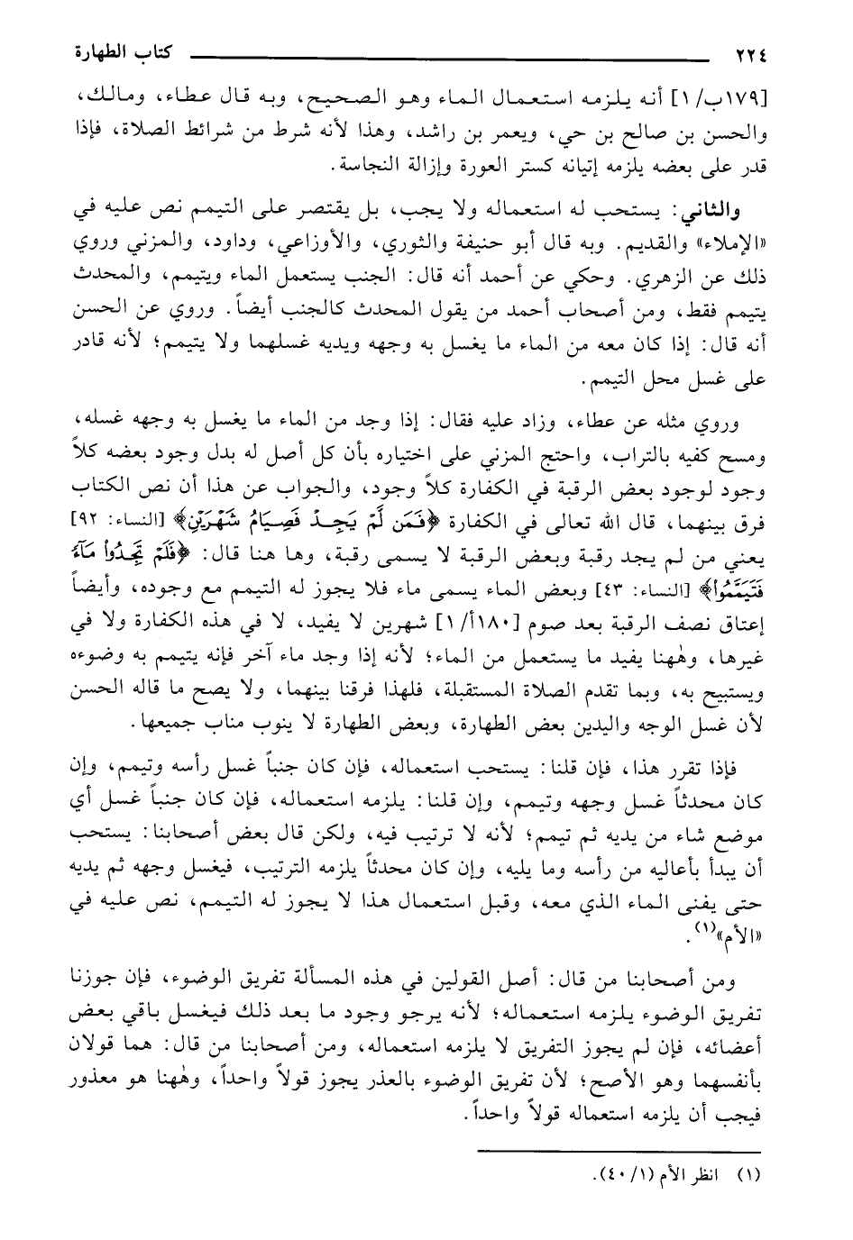 وروى مثله عن عطاء, وزاد عليه فقال: إذا وجد من الماء ما يغسل به غسله, ومسح كفيه بالتراب, واحتج المزني على اختياره بان كل أصل له بدل وجود بعضه كلا وجود لوجود بغض الرقبة في الكفارة كلا وجود, والجواب عن هذا نص الكتاب فرق بينهما, قال الله تعالى في الكفارة {َمَن لَّمْ يَجِدْ فَصِيَامُ شَهْرَيْنِ} [النساء: 92] يعني من لم يجد رقبة وبغض الرقبة لا يسمى رقبة, وها هنا قال: {فَلَمْ تَجِدُوا مَاءً فَتَيَمَّمُوا} [النساء: 43]