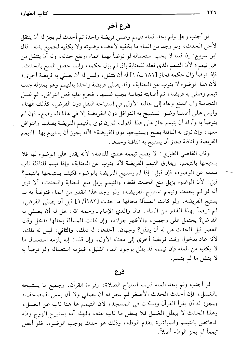 وقال القاضي الطبري: لا يصح تيممه عندي للنافلة؛ لأنه يقدر على الوضوء لها فلا يستبحها بالتيمم, ويفارق التيمم الفريضة لأنه ينوب عن الجنابة, وإذا تيمم للنافلة ناب تيممه عن الوضوء, فإن قيل: إذا لم يستبيح الفريضة بالوضوء فكيف يستبيحها بالتيمم؟ قيل: لأن الوضوء يزيل منع الحدث فقط, والتيمم يزيل منع الجنابة والحدث, ألا ترى أنه لو لم يحدث وتيمم استباح الفريضة, ولو وجد هذا القدر من الماء فتوضأ به لم يستبح الفريضة, ولو كانت المسألة بحالها ما حدث [182 ب/1] قبل الفرض, ثم توضأ بهذا القدر من الماء. قال والدي الإمام- رحمه الله: هل أن يصلي به الفرض؟ يحتمل على وجهين, والأظهر جوازه, وإن كانت المسألة بحالها فدخل وقت العصر قبل الحدث هل له أن ينتقل؟ وجهان: أحدهما: له ذلك, والثاني: ليس له ذلك, لأنه عاد بدخول وقت فريضة أخرى إلى معناه الأول, وإن قلنا: إنه يلزمه استعمال ما لا يكفيه من الماء فإن تيممه قد بطل بوجود الماء القليل, فيلزمه استعماله ولو توضأ به لا ينتقل ما لم يتيمم.