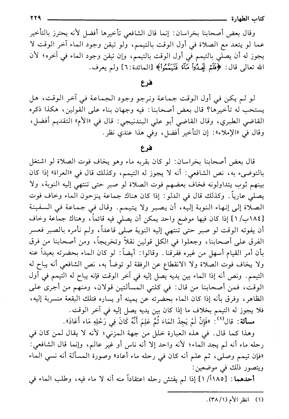 وقال بعض أصحابنا بخراسان: إنما قال الشافعي تأخيرها أفضل لأنه يحترز بالتأخير عما لو .... مع الصلاة في أول الوقت بالتيمم, ولو تيقن وجود الماء آخر الوقت لا يجوز له أن يصلي بالتيمم في أول الوقت بالتيمم, وإن تيقن وجود الماء في آخره؛ لأن الله تعالى قال: {فَلَمْ تَجِدُوا مَاءً فَتَيَمَّمُوا} ولم يعرف.