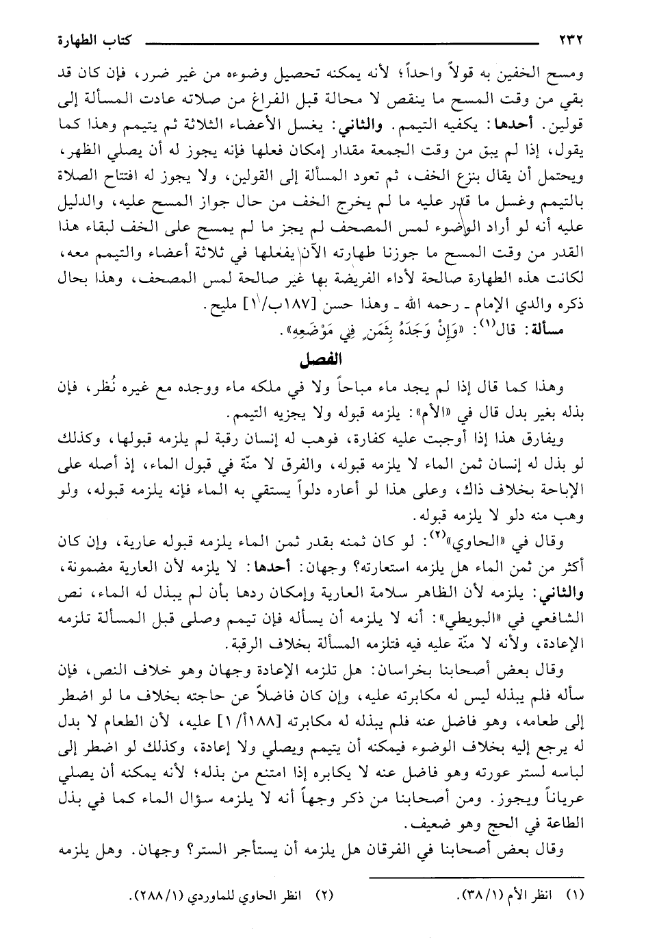وقال في (الحاوي): لو كان لو كان ثمن الماء يلزمه قبوله عارية, وإن كان أكثر من ثمن الماء هل يلزمه استعارته؟ وجهان: أحدها: لا يلزمه لأن العارية مضمونه, والثاني: يلزمه لأن الظاهر سلامة العارية وإمكان ردها بأن لم يبذل له الماء, نص الشافعي في (البويطي): أنه لا يلزمه أن يسأله فإن تيمم وصلى قبل المسألة تلزمه الإعادة, ولأنه لا منة عليه فيه فتلزمه المسألة بخلاف الرقبة.