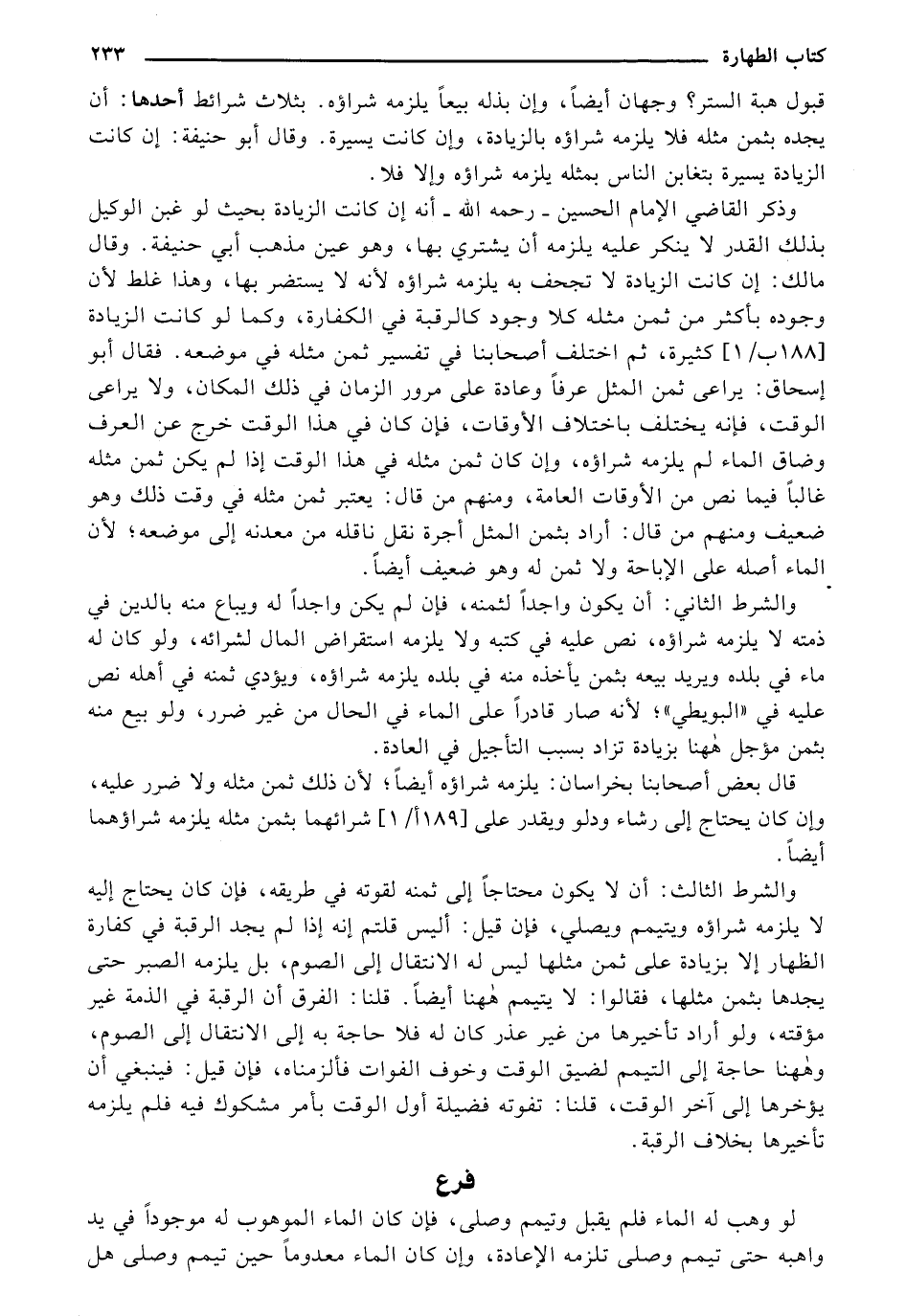 وذكر القاضي الإمام الحسين (رحمه الله) أنه إن كانت الزيادة بحيث لو غبن الوكيل بذلك القدر لا ينكر عليه يلزمه شراؤه لأنه لا يستضر بها, وهذا غلط لأن وجوده بأكثر من ثمن مثله كلا وجود كالرقبة في الكفارة, وكما لو كانت الزيادة (189/ 1) كثيرة, ثم اختلف أصحابنا في تفسير ثمن مثله في موضعه, فقال أبو إسحاق: يراعي ثمن المثل عرفًا وعادة على مرور الزمان في ذلك المكان, ولا يراعي الوقت, فإنه يختلف باختلاف الأوقات, فإن كان في هذا الوقت خرج عن العرف وضاق الماء لم يلزمه شراؤه, وإن كان ثمن مثله في هذا الوقت إذا لم يكن ثمن مثله غالبًا فيما نص من الأوقات العامة, ومنهم من قال: يعتبر