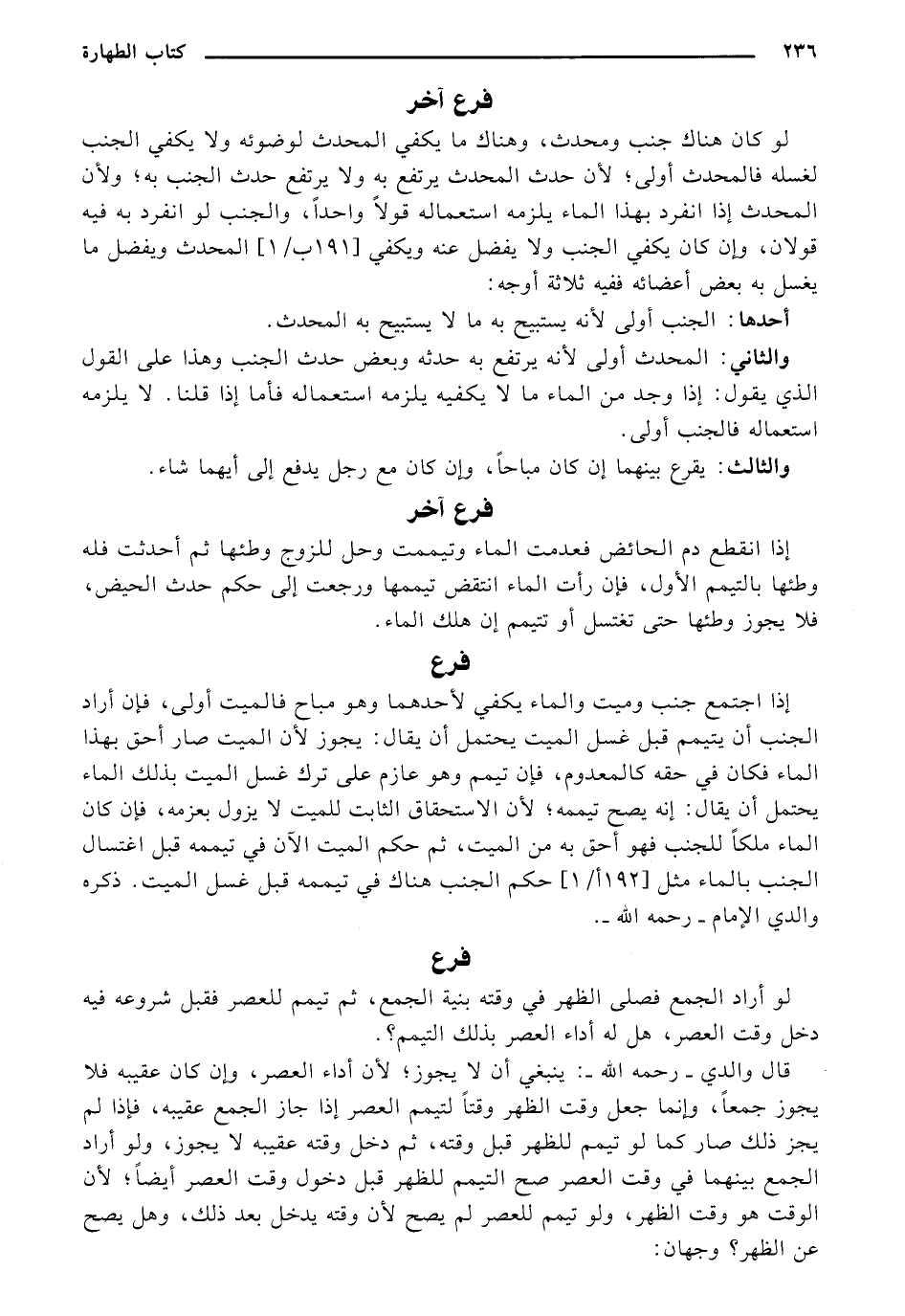 إذا اجتمع جنب وميت والماء يكفي لأحدهما وهو مباح فالميت أولى, فإن أراد الجنب أن يتيمم قبل غسل الميت يحتمل أن يقال: يجوز لأن الميت صار أحق بهذا الماء فكان في حقه كالمعدوم, فإن تيمم وهو عازم على ترك غسل الميت بذلك الماء يحتمل أن يقال: إنه يصح تيممه, لأن الاستحقاق الثابت للميت لا يزول بعزمه, فإن كان الماء ملكًا للجنب فهو أحق به من الميت, ثم حكم الميت الآن في تيممه قبل اغتسال الجنب بالماء مثل (192 ب/1) حكم الجنب هناك في تيممه قبل غسل الميت, ذكره والدي الإمام - رحمه الله-.