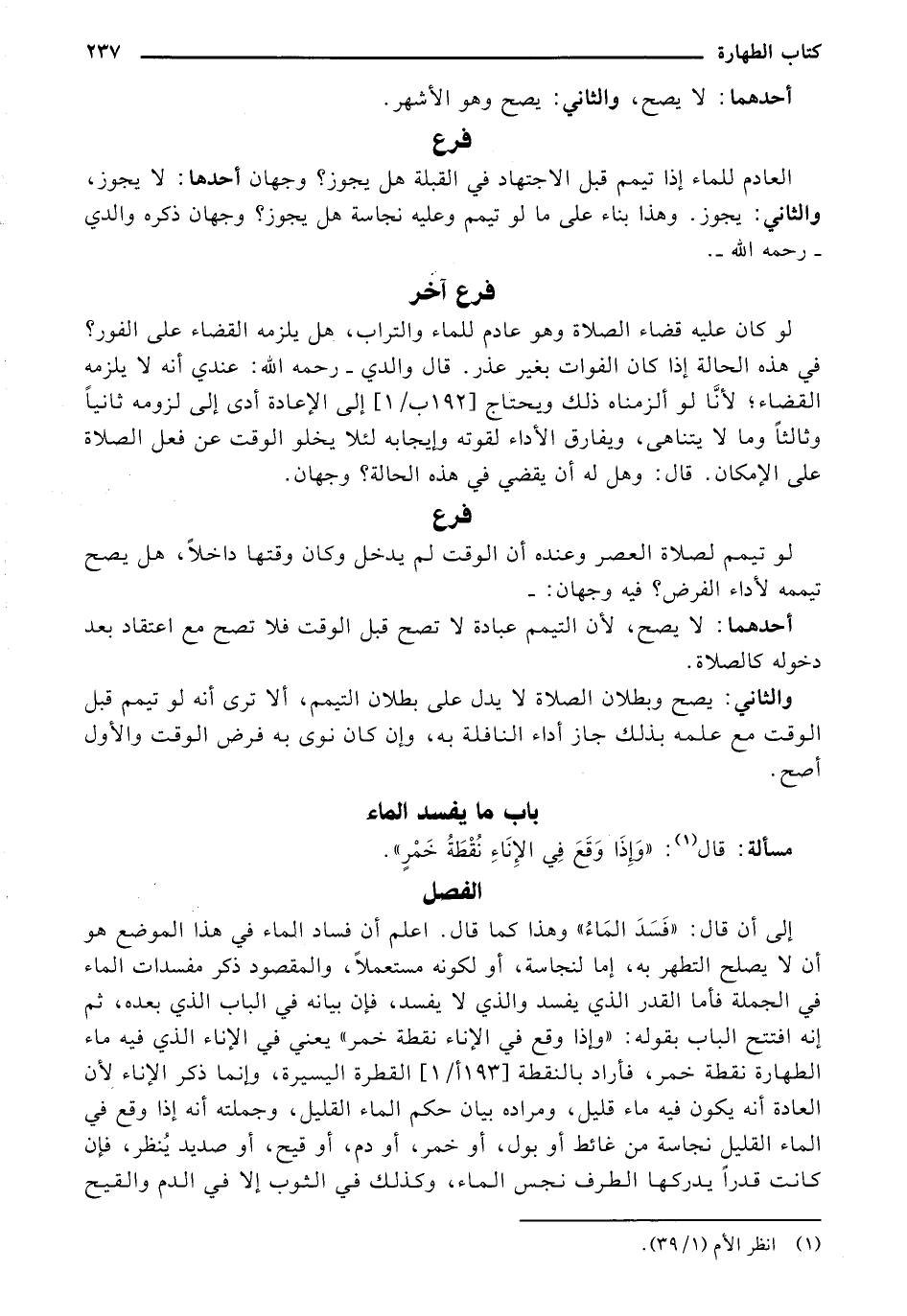 إلى أن قال: (فسد الماء) وهذا كما قال: أعلم أن فساد الماء في هذا الموضع هو أن لا يصلح التطهر به, إما لنجاسة, أو لكونه مستعملًا, والمقصود ذكر مفسدات الماء في الجملة فأما القدر الذي يفسد والذي لا يفسد, فإن بيانه في الباب الذي بعده, ثم إنه افتتح الباب بقوله: (وإذا وقع في الإناء نقطة خمر) يعني في الإناء الذي فيه ماء الطهارة نقطة خمر, فأراد بالنقطة (193 ب/1) القطرة اليسيرة, وإنما ذكر الإناء لأن العادة أنه يكون فيه ماء قليل, ومراده بيان حكم الماء القليل, وجملته أنه إذا وقع في الماء القليل نجاسة من غائط أو بول, أو خمر, أو دم, أو قيح, أو صديد يُنظر, فإن كانت قدرًا يدركها الطرف نجس الماء, وكذلك في الثوب إلا في الدم والقيح