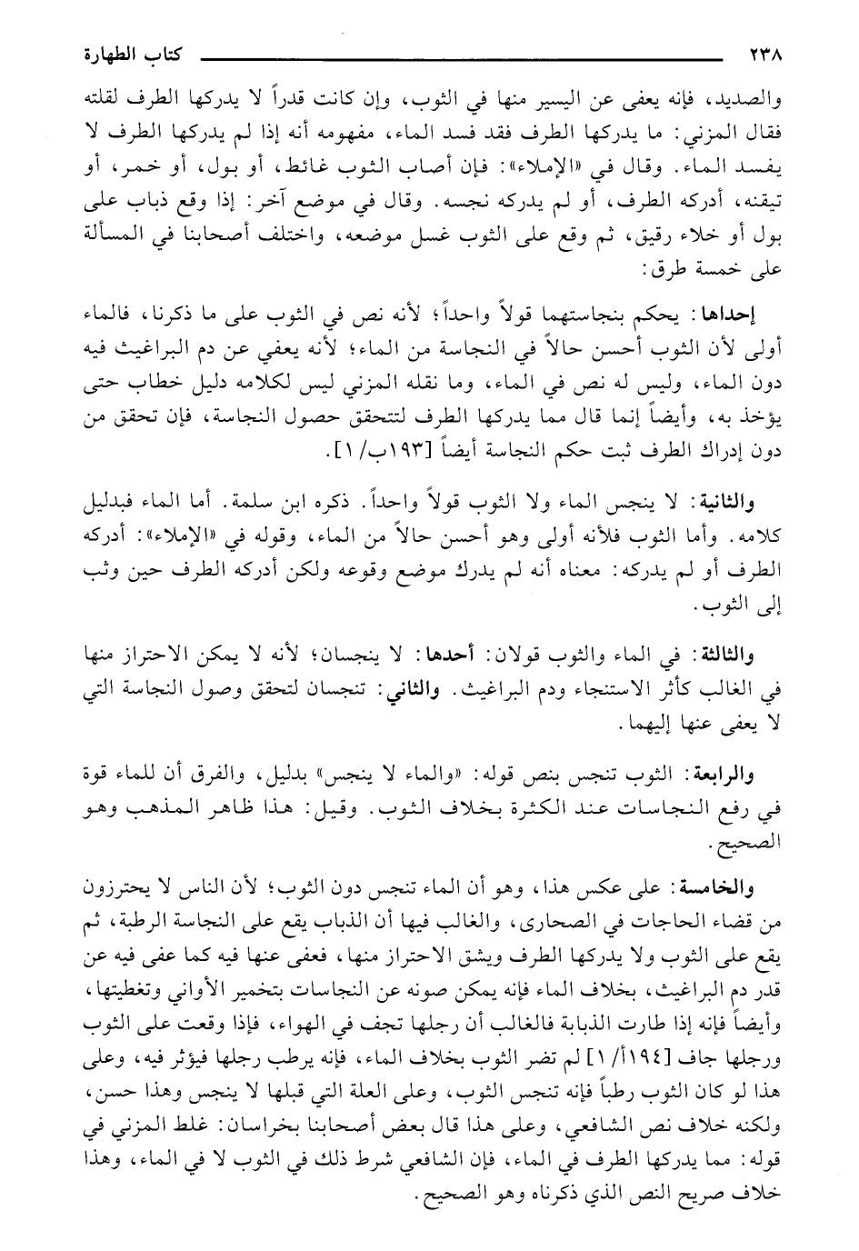 والخامسة: على عكس هذا, وهو أن الماء تنجس دون الثوب؛ لأن الناس لا يحترزون من قضاء الحاجات في الصحاري, والغالب فيها أن الذباب يقع على النجاسة الرطبة, ثم يقع على الثوب ولا يدركها الطرف ويشق الاحتراز منها, فعفي عنها فيه كما عفي فيه عن قدر دم البراغيث, بخلاف الماء فإنه يمكن صونه عن النجاسات بتخمير الأواني وتغطيتها, وأيضًا فإنه إذا طارت الذبابة فالغالب أن رجلها تجف في الهواء, فإذا وقعت على الثوب ورجلها جاف (194 ب/1) لم تضر الثوب بخلاف الماء, فإنه يرطب رجلها فيؤثر فيه, وعلى هذا لو كان الثوب رطبًا فإنه تنجس الثوب, وعلى العلة التي قبلها لا ينجس وهذا حسن, ولكنه خلاف نص الشافعي, وعلى هذا قال بعض أصحابنا بخراسان: غلط المزني في قوله: مما يدركها الطرف في الماء, فإن الشافعي شرك ذلك في الثوب لا في الماء, وهذا خلاف صريح النص الذي ذكرناه وهو الصحيح.