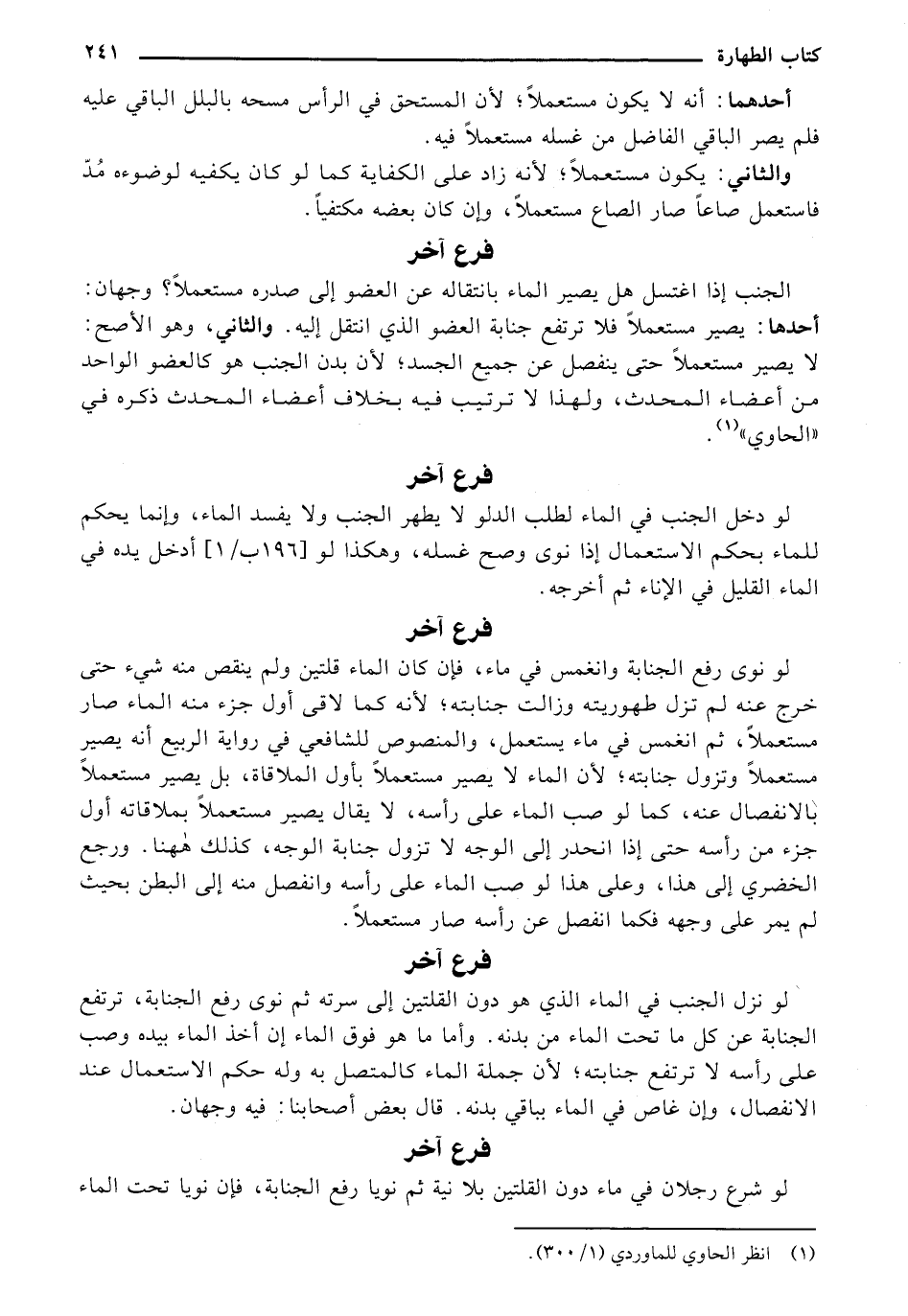 لو نوى رفع الجبانة وانغمس ف ماء, فإن كان الماء قلين ولم ينقص منه شيء حتى خرج عنه لم تزل طهوريته وزالت جنابته, لأنه كما لاقي أول جزء منه الماء صار مستعملًا, ثم انغمس في ماء يستعمل, والمنصوص للشافعي في رواية الربيع أنه يصير مستعملًا وتزول جنابته, لأن الماء لا يصير مستعملًا بأول الملاقاة, بل يصير مستعملًا بالانفصال عنه, كما لو صب الماء على رأسه, لا يقال يصير مستعملًا بملاقاته أول جزء من رأسه حتى إذا أنحدر إلى الوجه لا تزول جنابة الوجه, كذلك ها هنا, ورجع الخضري إلى هذا, وعلى هذا لو صب الماء على رأسه وانفصل منه إلى البطن بحيث لم يمر على وجهه فكما انفصل عن رأسه صار مستعملًا.