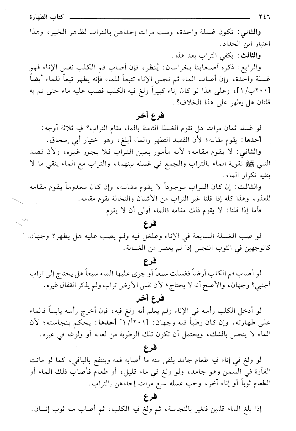 والرابع: ذكره أصحابنا بخراسان: يُنظر, فإن أصاب فم الكلب نفس الإناء فهو غسلة واحدة, وإن أصاب الماء ثم نجس الإناء تتبعًا للماء فإنه يطهر تبعًا للماء أيضًا (201 أ/1) وعلى هذا لو كان إناء كبيرًا ولغ فيه الكلب فصب عليه ماء حتى تم به قلتان هل يطهر على هذا الخلاف؟