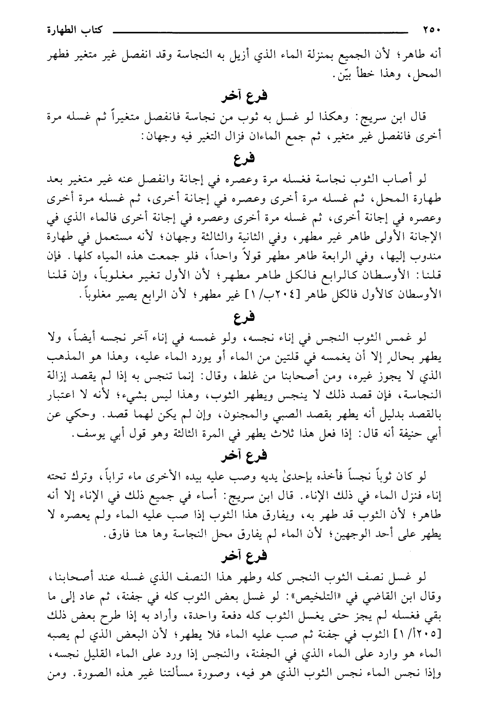 لو كان ثوبًا نجسًا فأخده بإحدى يديه وصب عليه بيده الأخرى ماء ترابًا, وترك تحته إناء فنزل الماء في ذلك الإناء, قال إبن سريج: أساء في جميع ذلك في الإناء إلا أنه طاهر, لأن الثوب قد طهر به, ويفارق هذا الثوب إذا صب عليه الماء ولم يعصره لا يطهر على أحد الوجهين, لأن الماء لم يفارق محل النجاسة وها هنا فارق.