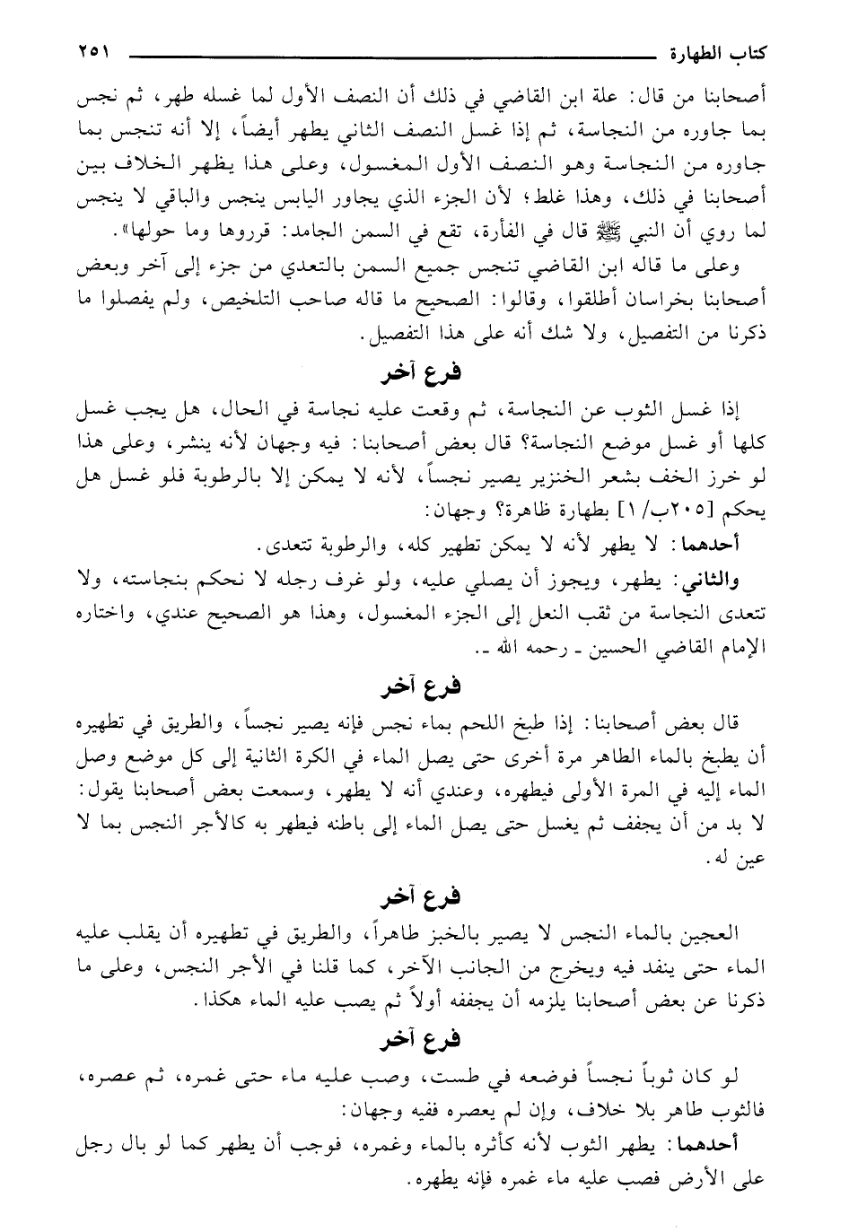 أصحابنا من قال: علة إبن القاضي في ذلك أن النصف الأول لما غسله طهر, ثم نجس بما جاوره من النجاسة, ثم إذا غسل النصف الثاني يطهر إيضًا, إلا أنه تنجس بما جاوزه من النجاسة وهو النصف الأول المغسول, وعلى هذا يظهر الخلاف بين أصحابنا في ذلك, وهذا غلط, لأم الجزء الذي يجاور اليابس ينجس والباقي لا ينجس لما روي أن النبي (صلى الله عليه وسلم) قال في الفأرة, تقع في السمن