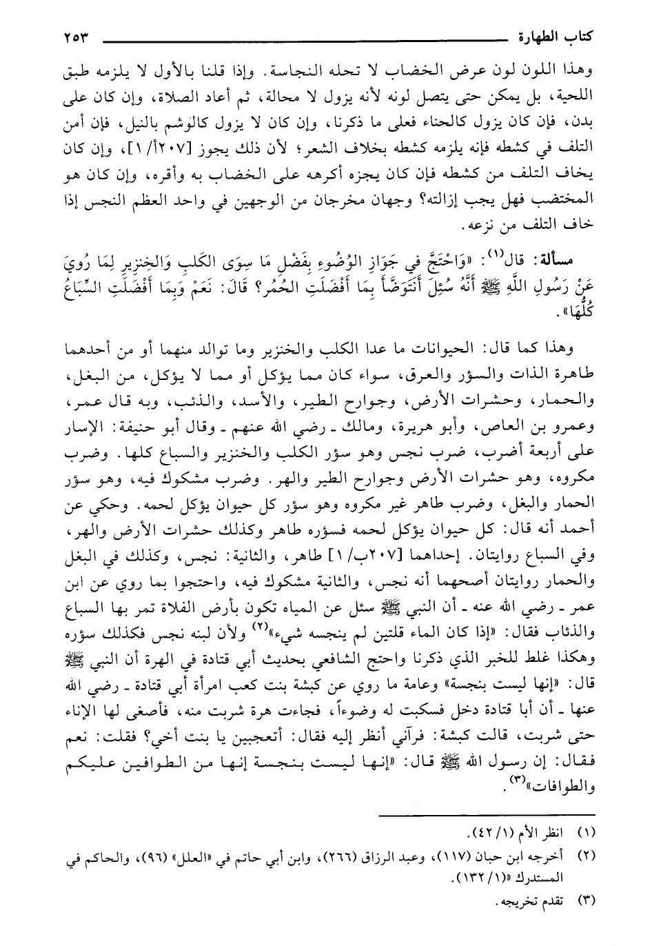 وهذا كما قال: الحيوانات ما عدا الكلب والخنزير وما توالد منهما أو من أحدهما طاهرة الذات والسؤر والعرق, سواء كان مما يؤكل أو مما لا يؤكل, من البغل, والحمار, وحشرات الأرض, وجوراح الطير, والأسد,. والذئب, وبه قال عمر, وعمرو بن العاص, وأبو هريرة, ومالك (رضي الله عنهم) وقال أبو حنيفة: الأسأر على أربعة أضرب, ضرب نجس وهو سؤر الكلب والخنزير والسباع كلها, وضرب مكروه, وهو حشرات الأرض وجوارح الطير والهر, وضرب مشكوك فيه, وهو سؤر الحمار والبغل, وضرب طاهر غير