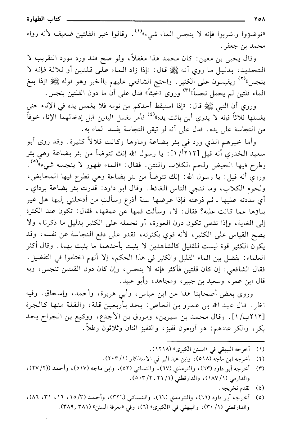 وأما خبرهم الذي ورد في بئر بضاعة وماؤها وكانت قلالًا كثيرة. وقد روى أبو سعيد الخدري أنه قيل (212 ب/ 1): يا رسول الله إنك تتوضأ من بئر يطرح فيها الحيض ولحم الكلاب والنتن. فقال: "الماء طهور لا ينجسه شيء ". وري أنه قيل: يا رسول الله: إنك تتوضأ من بئر بضاعة وهي تطرح فيها المحايض، ولحوم الكلاب، وما ننجي الناس الغائط. وقال أبو داود: قدرت بئر بضاعة برداي- أي مددته عليها- ثم ذرعته فإذا عرضها ستة أذرع وسألت من أدخلني إليها هل غير بناؤها عما كانت عليها؟ فقال: لا،