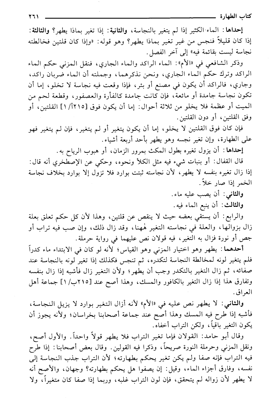 (إحداها): الماء الكثير إذا لم يتغير بالنجاسة، والثانية: إذا تغير بماذا يطهر؟ والثالثة: إذا كان قليلًا فنجس من غير تغير بماذا يطهر؟ وهو قوله:"وإذا كان قلتين فخالطته نجاسة ليست بقائمة فيه" إلى آخر الفصل.