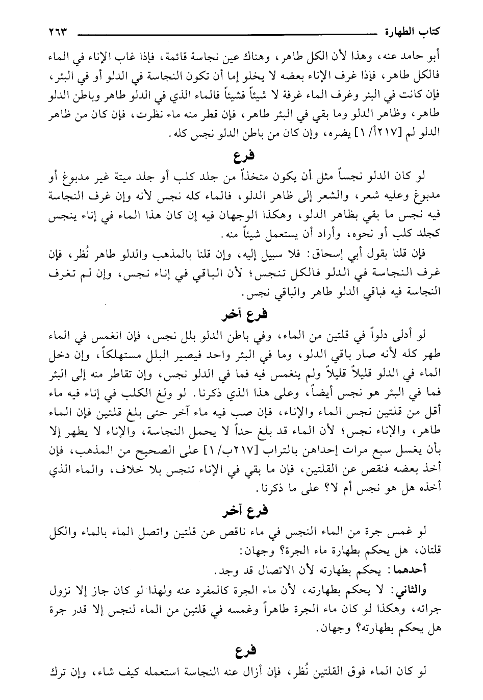 لو أدلى دلوًا في قلتين من الماء، وفي باطن الدلو بلل نجس، فإن انغمس في الماء طهر كله لأنه صار باقي الدلو، وما في البئر واحد فيصير البلل مستهلكًا، وإن دخل الماء في الدلو قليلًا قليلًا ولم ينغمس فيه فما في الدلو نجس، وإن تقاطر منه إلى البئر فما في البئر هو نجس أيضًا، وعلى هذا الذي ذكرناه. لو ولغ الكلب في إناء ماء أقل من قلتين نجس الماء والإناء، فإن صب فيه ماء آخر حتى بلغ قلتين فإن الماء طاهر، والإناء نجس، لأن الماء قد بلغ حدًا لا يحمل النجاسة، والإناء لا يطهر إلا بأن يغسل سبع مرات إحداهن بالتراب (218/ 1) على الصحيح من المذهب، فإن أخذ بعضه فنقص عن القلتين، فإن ما بقى في الإناء تنجس بلا خلاف، والماء الذي أخذه هل هو نجس أم لا؟ على ما ذكرنا.