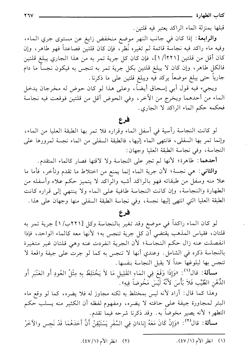 والرابعة: إذا كان في جانب النهر موضع منخفض زايغ عن مستوى جري الماء، وفيه ماء راكد فيه نجاسة قائمة لم تغيره نظر، فإن كان قلتين فصاعدًا فهو طاهر، وإن كان أقل من قلتين [221 ب/ 1]، فإن كان كل جرية تمر به من هذا الجاري يبلغ قلتين فالكل طاهر، وإن كان لا يبلغ قلتين بكل جرية تمر به تنجس به فيكون نجسًا ما دام جاريًا حتى يبلغ موضعًا يركد فيه ويبلغ قلتين على ما ذكرنا.