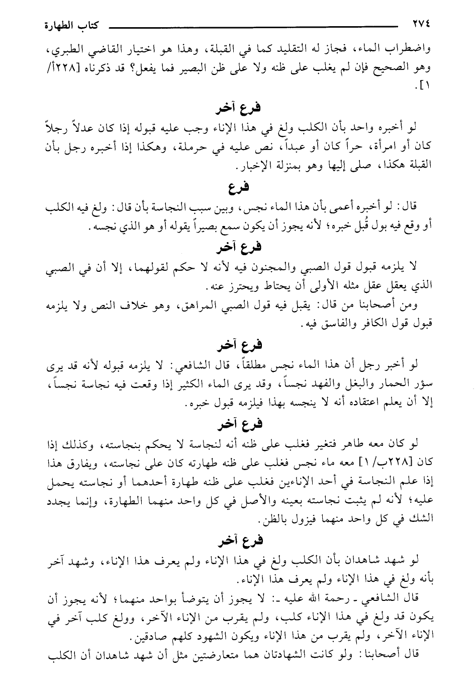 لو أخبره واحد بأن الكلب ولغ في هذا الإناء وجب عليه قبوله إذا كان عدلًا رجلًا كان أو امرأة، حرًا كان أو عبدًا، نص عليه في حرملة، وهكذا إذا أخبره رجل بأن القبلة هكذا، صلى إليها وهو بمنزلة الإخبار.