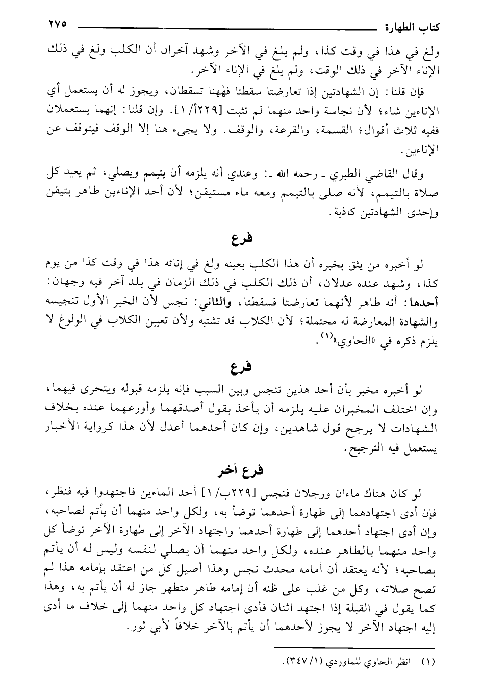لو اخبره من يثق بخبره آن هذا الكلب بعينه ولغ في إنائه هذا في ونت كذا من يوم كذا، وشهد عنده عدلان، أن ذلك الكلب في ذلك الزمان في بلد آخر فيه وجهان: أحدها: أنه طاهر لأنهما تعارضتا فسقطتا، والثاني: نجس لأن الخبر الأول تنجيسه والشهادة المعارضة له محتملة؛ لأن الكلاب قد تشتبه ولأن تعيين الكلاب في الولوغ لا يلزم ذكره في ((الحاوي)).