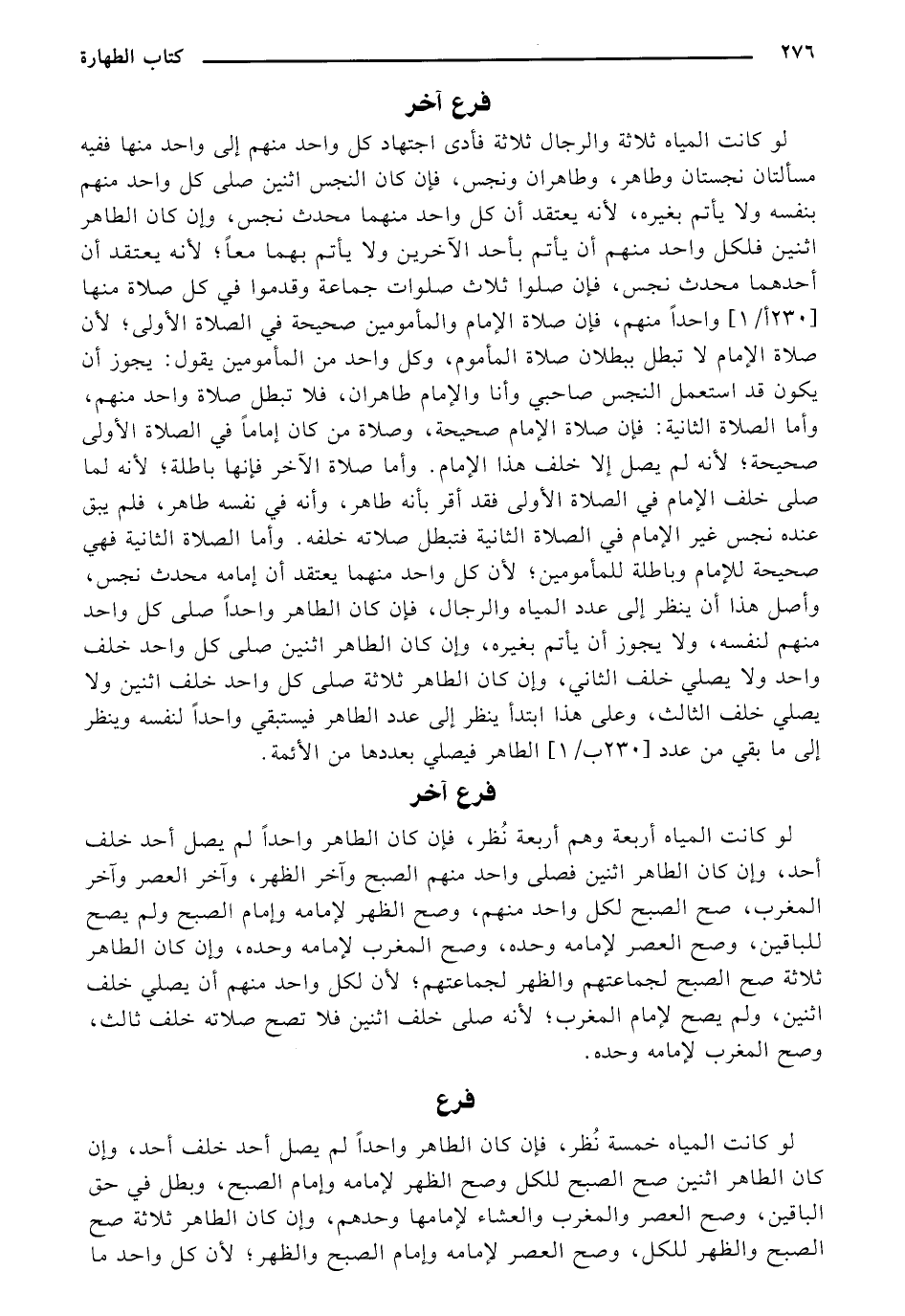 صاحبي وأنا والإمام طاهران، فلا تبطل صلاة واحد منهم، وأما الصلاة الثانية: فإن صلاة الإمام صحيحة، وصلاة من كان إمامًا في الصلاة الأولى صحيحة؛ لأنه لم يصل إلا خلف هذا الإمام,. وأما صلاة الآخر. فإنها باطلة؛ لأنه لما. صلى خلف الإمام في الصلاة الأولى فقد أقر بأنه طاهر، وأنه في نفسه طاهر، فلم يبق عنده نجس غير الإمام في الصلاة الثانية فتبطل صلاته خلفه. وأما الصلاة الثانية فهي صحيحة للإمام وباطلة للمأمومين؛ لأن كل واحد منهما يعتقد أن إمامه محدث نجس، وأصل هذا أن ينظر إلى عدد , المياه والرجال، فإن كان الطاهر واحدًا صلى كل واحد منهم لنفسه، ولا يجوز أن يأتم بغيره، وإن كان الطاهر اثنين صلى كل واحد خلف واحد ولا يصلي خلف الثاني، وإن كان الطاهر ثلاثة صلى كل واحد خلف اثنين ولا يصلي خلف الثالث، وعلى هذا ابتدأ ينظر إلى عدد الطاهر فيتبقي واحدًا لنفسه وينظر إلى ما بقي من عدد] 231 أ/1] الطاهر فيصلي بعددها من الأئمة.
