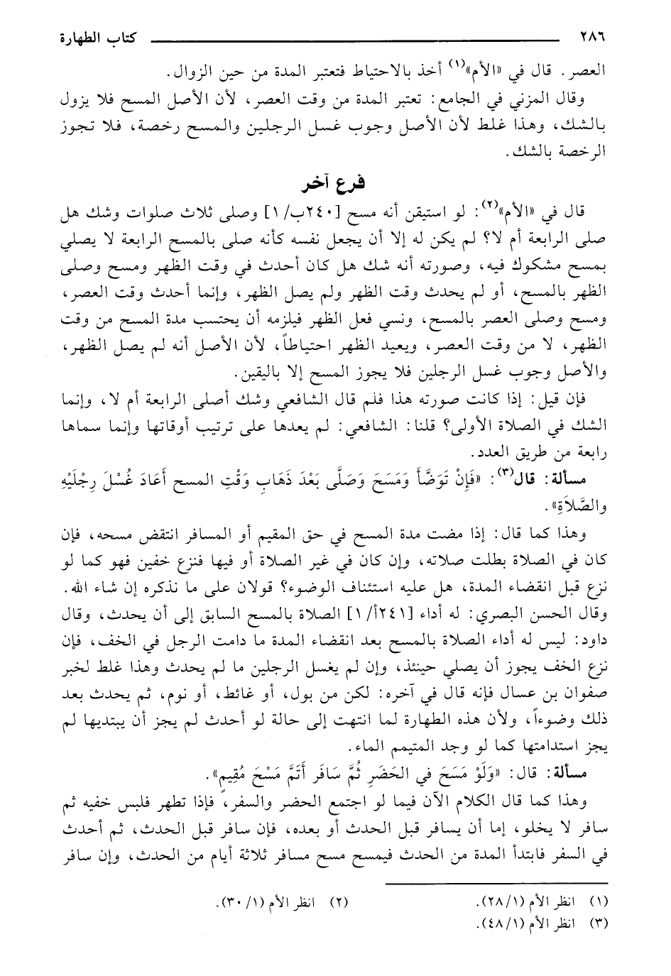 وقال المزني في الجامع: تعتبر المدة من وقت العصر، لأن الأصل المسح فلا يزول بالشك، وهذا غلط لأن الأصل وجوب غسل الرجلين والمسح رخصة، فلا تجوز الرخصة بالشك.