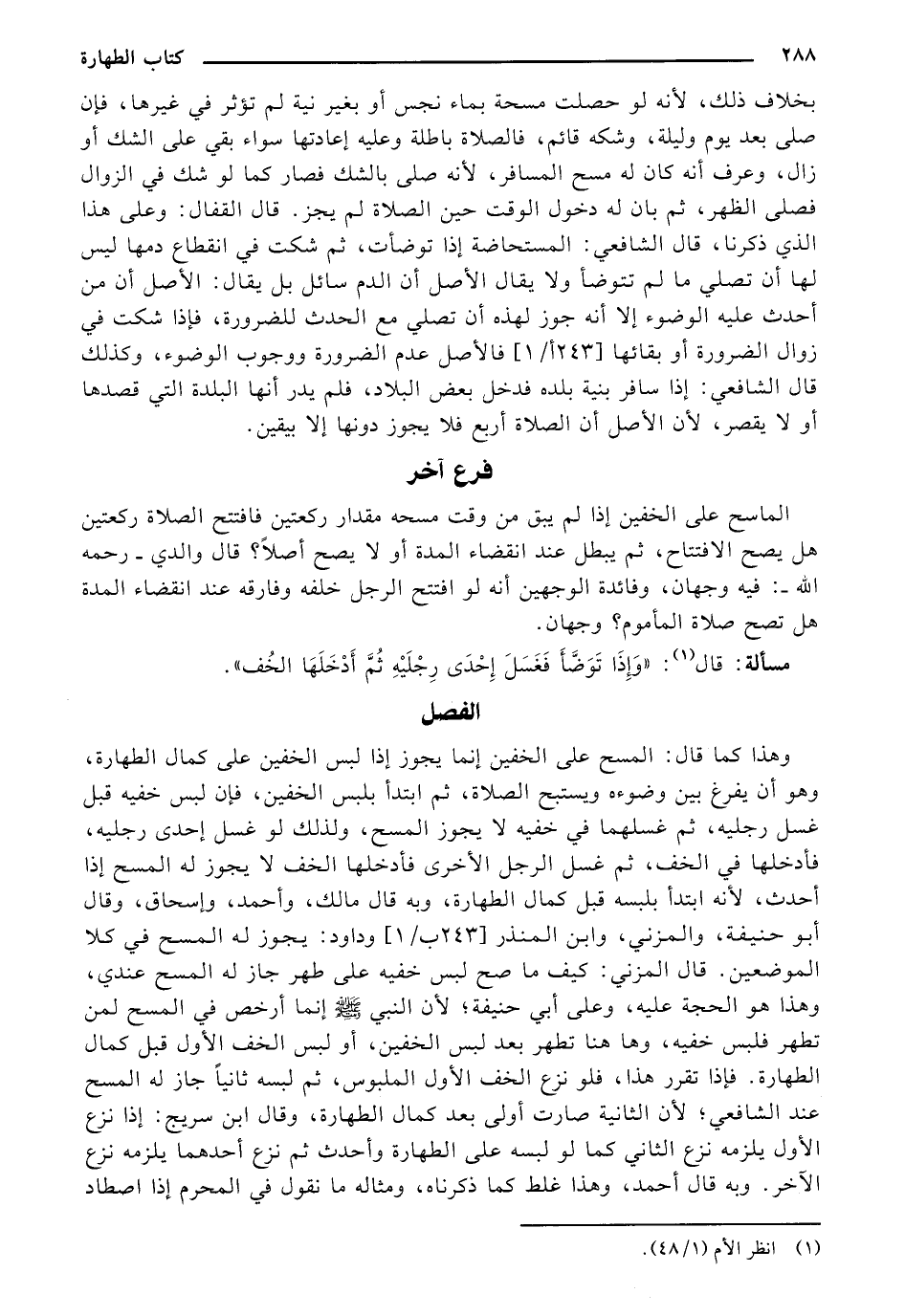 بخلاف ذلك، لأنه لو حصلت مسحة بماء نجس أو بغير نية لم تؤثر في غيرها، فإن صلى بعد يوم وليلة، وشكه قائم، فالصلاة باطلة وعليه إعادتها سواء بقي على الشك أو زال، وعرف أنه أن له مسح المسافر، لأنه صلى بالشك فصار كما لو شك في الزوال فصلى الظهر، ثم بان له دخول الوقت حين الصلاة لم يجز. قال القفال: وعلى هذا الذي ذكرنا، قال الشافعي: المستحاضة إذا توضأت، ثم شكت في انقطاع دمها ليس لها أن تصلي ما لم تتوضأ ولا يقال الأصل أن الدم سائل بل يقال: الأصل أن من أحدث عليه الوضوء إلا أنه جوز لهذه أن تصلي مع الحدث للضرورة، فإذا شكت في زوال الضرورة أو بقائها [243 ب/1] فالأصل عدم الضرورة ووجوب الوضوء، وكذلك قال الشافعي: إذا سافر بنية بلده فدخل بعض البلاد، فلم يدر أنها البلدة التي قصدها أو لا يقصر، لأن الأصل أن الصلاة أربع فلا يجوز دونها إلا بيقين.