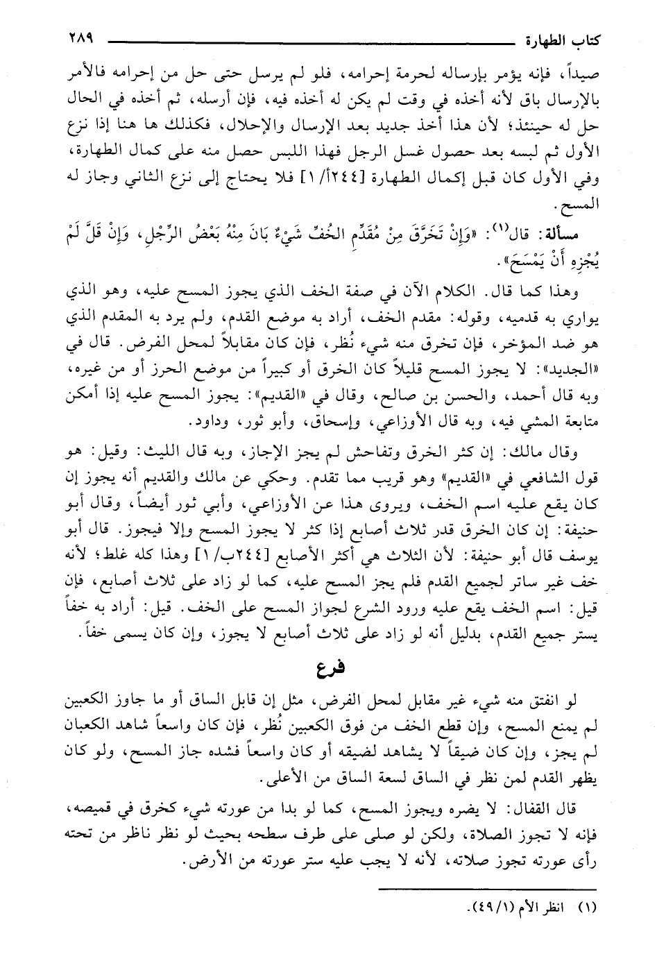 وهذا كما قال. الكلام الآن في صفة الخف الذي يجوز المسح عليه، وهو الذي يواري به قدميه، وقوله: مقدم الخف، أراد به موضع القدم، ولم يرد به المقدم الذي هو ضد المؤخر، فإن تخرق منه شيء نُظر، فإن كان مقابلًا لمحل الفرض. قال في "الجديد": لا يجوز المسح قليلًا كان الخرق أو كبيرًا من موضع أو من غيره، وبه قال أحمد،