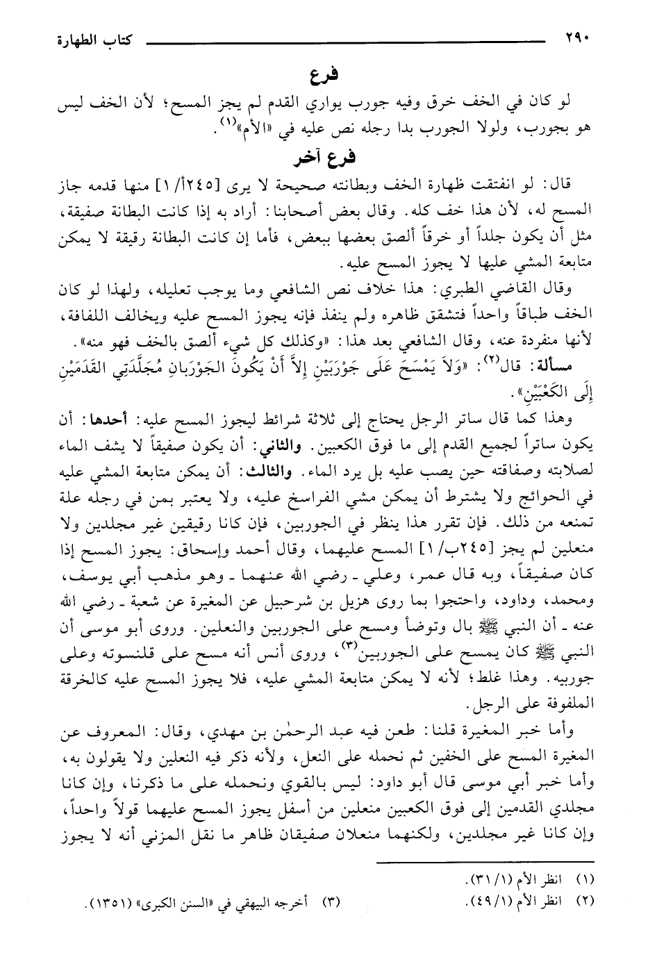 وقال القاضي الطبري: هذا خلاف نص الشافعي وما يوجب تعليله، ولهذا لو كان الخف طباقًا واحدًا فتشقق ظاهره ولم ينفذ فإنه يجوز المسح عليه ويخالف اللفافة، لأنها منفردة عنه، وقال الشافعي بعد هذا: "وكذلك كل شيء ألصق بالخف فهو منه".