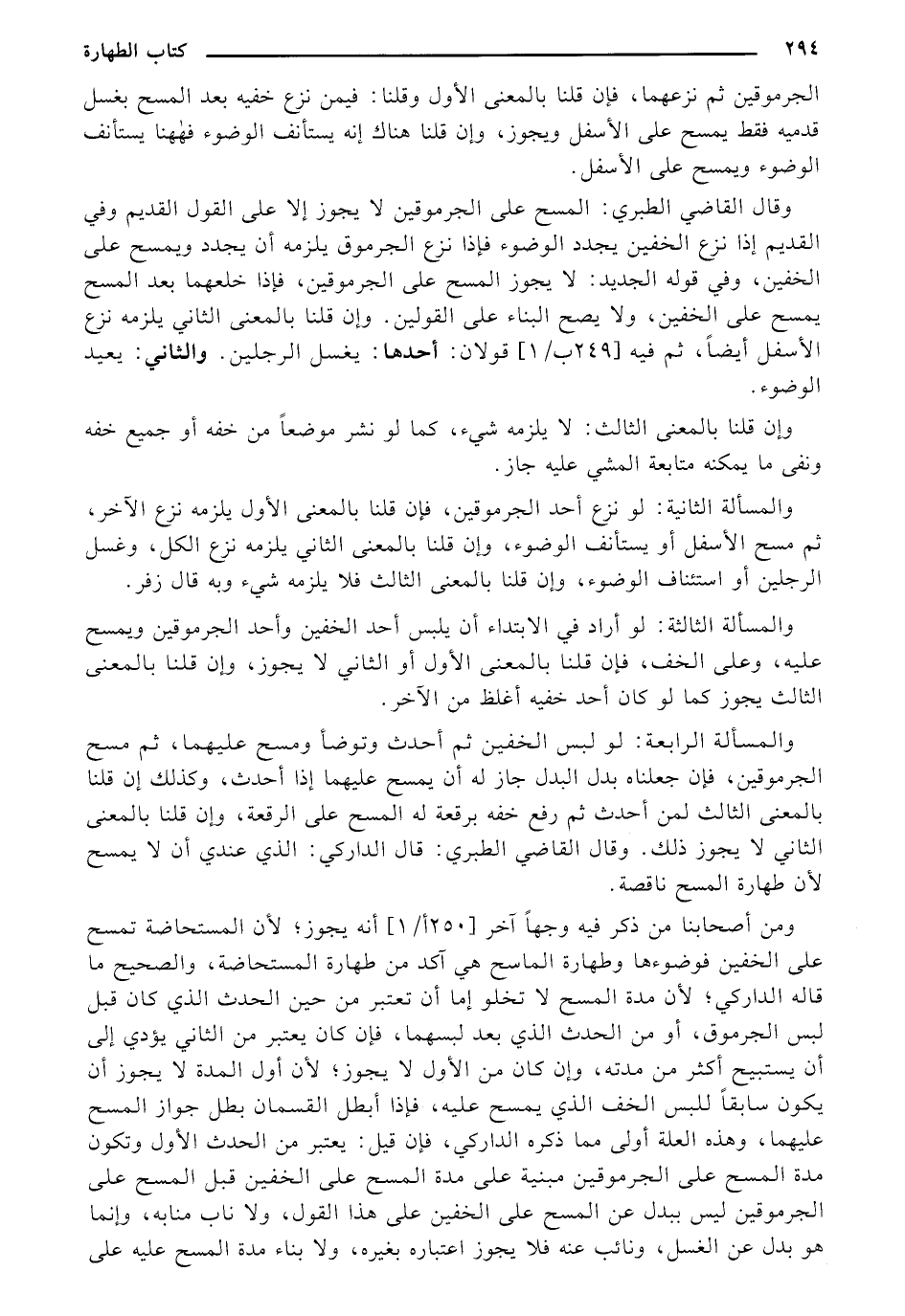 والمسألة الرابعة: لو لبس الخفين ثم أحدث وتوضأ ومسح عليهما، ثم مسح الجرموقين، فإن جعلناه بدل البدل جاز له أن يمسح عليهما إذا أحدث، وكذلك إن قلنا بالمعنى الثالث لمن أحدث ثم رفع خفه برقعة له المسح على الرقعة، وإن قلنا بالمعنى الثاني لا يجوز ذلك. وقال القاضي الطبري: قال الداركي: الذي عندي أن لا يمسح لأن طهارة المسح ناقصة.