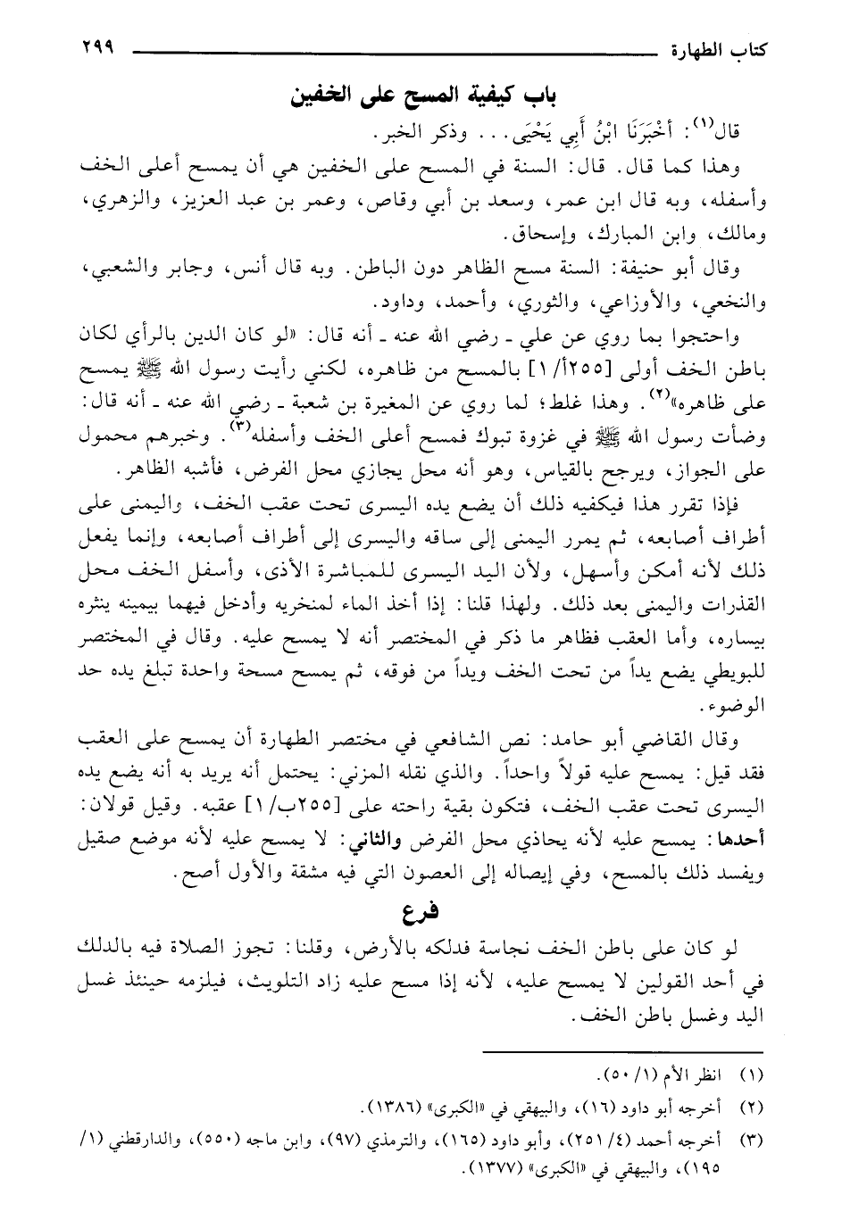 واحتجوا بما روي عن علي - رضي الله عنه - أنه قال: "لو كان الدين بالرأي لكان باطن الخف أولى [255 ب/1] بالمسح من ظاهره، لكني رأيت رسول الله صلى الله عليه وسلم يمسح على ظاهره". وهذا غلط؛ لما روي عن المغيرة بن شعبة - رضي الله عنه - أنه قال: وضأت رسول الله صلى الله عليه وسلم في غزوة تبوك فمسح أعلى الخف وأسفله، وخبرهم محمول على الجواز، ويرجح بالقياس، وهو أنه محل يجازي محل الفرض، فأشبه الظاهر.