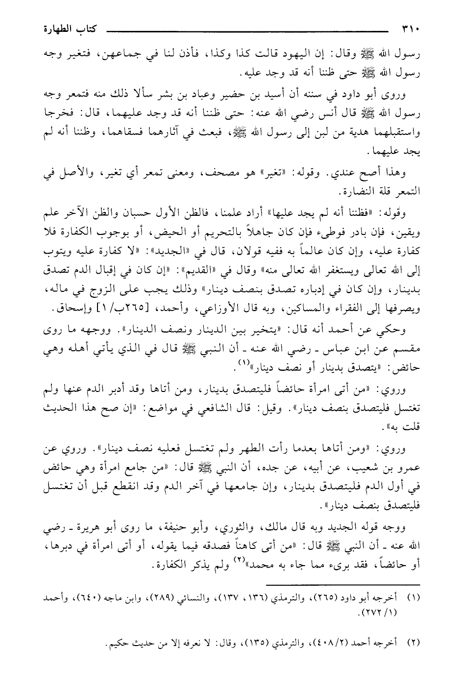 وروي:" ومن أتاها بعد ما رأت الطهر ولم تغتسل فعليه دينار". وروي عن عمرو بن شعيب، عن أبيه، عن جده، أن النبي صلى الله عليه وسلم قال:"من جامع امرأة وهي حائض في أو الدم فليتصدق بدينار، وإن جامعها في لآخر الدم وقد انقطع قبل أن تغتسل فليتصدق بنصف دينار".
