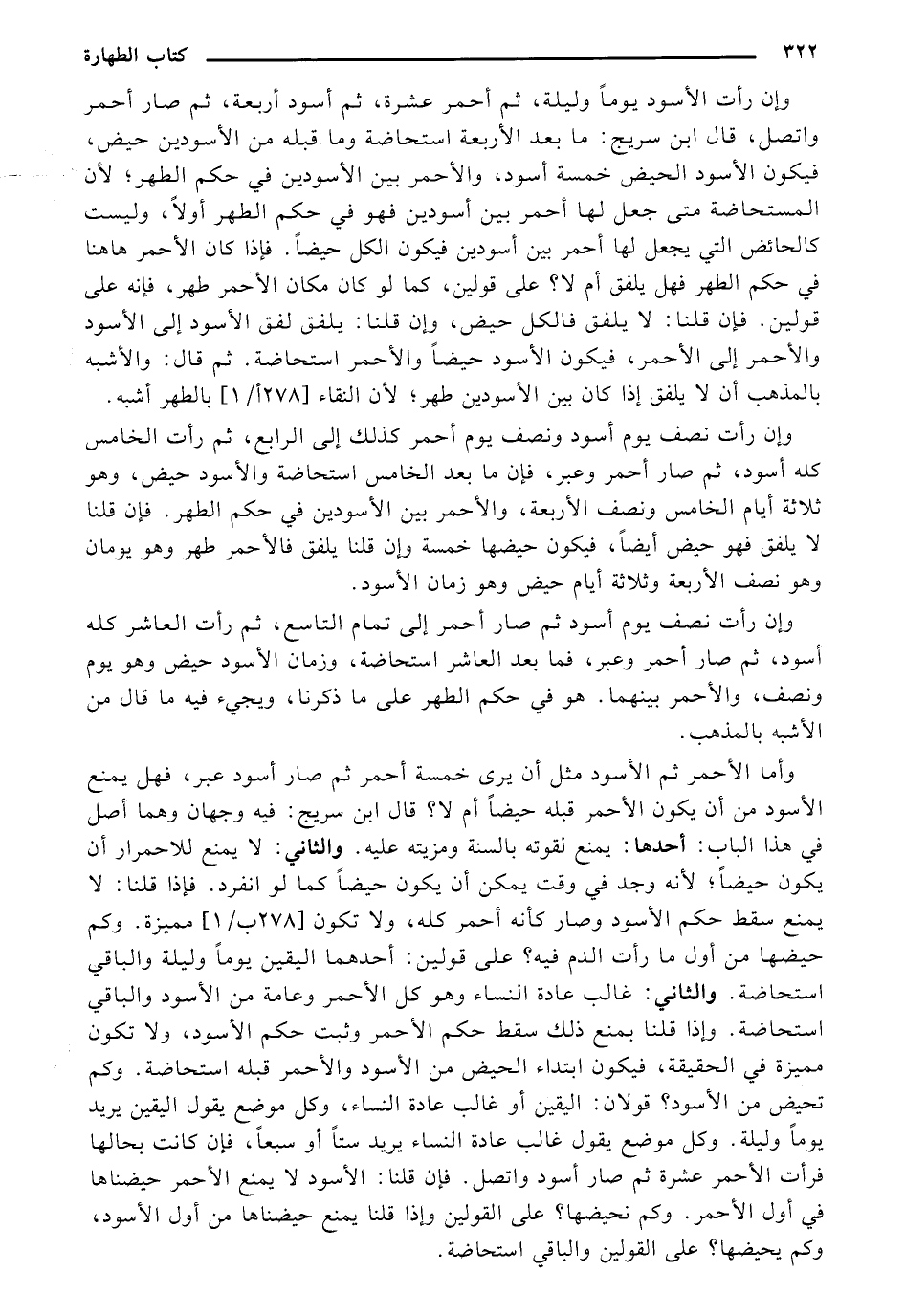 الحيض خمسة أسود، والأحمر بين الأسودين في حكم الطهر؛ لأن المستحاضة متى جعل لها أحمر بين أسودين فهو في حكم الطهر أولًا، وليست كالحائض التي يجعل لها أحمر بين أسودين فيكون الكل حيضًا. فإذا كان الأحمر هاهنا في حكم الطهر فهل يلفق أم لا؟ على قولين، كما لو كان مكان الأحمر طهر، فإنه على قولين. فإن قلنا: لا يلفق فالكل حيض، وإن قلنا: يلفق لفق الأسود إلى الأسود والأحمر إلى الأحمر، فيكون الأسود حيضًا والأحمر استحاضة. ثم قال: والأشبه بالمذهب أن لا يلفق إذا كان بين الأسودين طهر؛ لأن التقاء [278 ب/1] بالطهر أشبه.