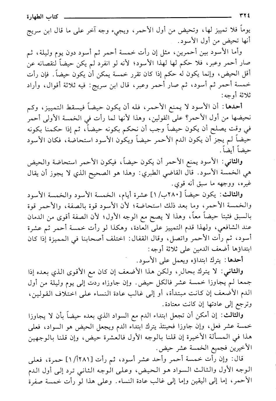والثاني: الأسود يمنع الأحمر أن يكون حيضًا، فيكون الأحمر استحاضة والحيض هي الخمسة الأسود. قال القاضي الطبري: هذا هو الصحيح الذي لا يجوز أن يقال غيره، ووجهه ما سبق لأنه قوي.