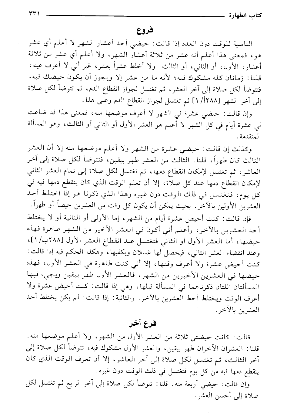 الناسية للوقت دون العدد إذا قالت: حيضي أحد أعشار الشهر لا أعلم أي عشر هو، فمعني هذا أعلم أنه عشر من ثلاثة أعشار الشهر، ولا أعلم أي عشر من ثلاثة أعشار. ولا أعلم أي عشر من ثلاثة أعشار، الأول، أو الثاني، أو الثالث، ولا أخلط عشرًا بعشر، غير أني لا أعرف عينه، قلنا: زمانان كله مشكوك فيه؛ لأنه ما من عشر إلا ويجوز أن يكون حيضك فيه، فتتوضأ لكل صلاة إلى أخر العشر، ثم تغتسل لجوزا انقطاع الدم، ثم تتوضأ لكل صلاة إلى أخر الشهر [288 ب/1] ثم تغسل لجواز انقطاع الدم وعلى هذا.