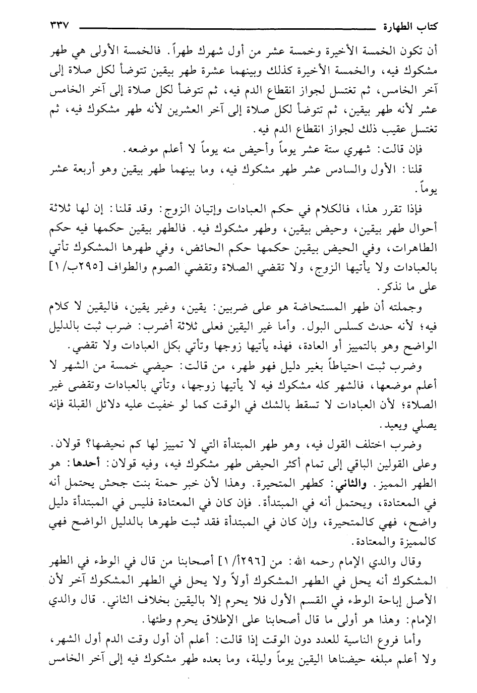 فإن تقرر هذا، فالكلام في حكم العبادات وإتيان الزوج: وقد قلنا: إن لها ثلاثة أحوال طهر بيقين، وحيض بيقين، وطهر مشكوك فيه. فالطهر بيقين حكمًا فيه حكم الطاهرات، وفي الحيض بيقين حكمها حكم الحائض، وفي طهرها المشكوك تأتي العبادات ولا يأتيها الزوج، ولا تقضي الصلاة وتقضي الصوم والطواف (296 أ/ 1) على ما نذكر.