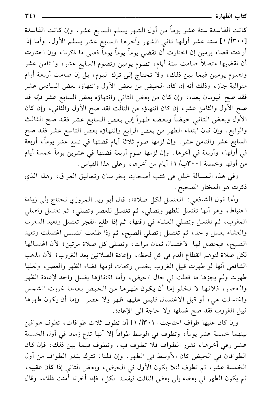 وإن كان عليها طواف احتاجت (301 ب/ 1) أن تطوف ثلاثة طوافات، تطوف طوافين بينهما خمسة عشر يومًا، وتطوف في الوسط طوافًا إلا أنها تدع زمان في أول الخمسة عشر وفي آخرها، تقرر الطواف فلا تطوف فيه، وتطوف فيما بين ذلك، فإن كان الطوافان في الحيض كان الأوسط في الطهر. وإن قلنا: تترك بقدر الطواف من أول الخمسة عشر، ثم تطوف لئلا يكون الأول في الحيض، وبعض الثاني إذا كان عقيبة، ثم يكون الطهر في بعضه إلى بعض الثالث فيفسد الكل، فإذا أخرته أمنت ذلك، وقال