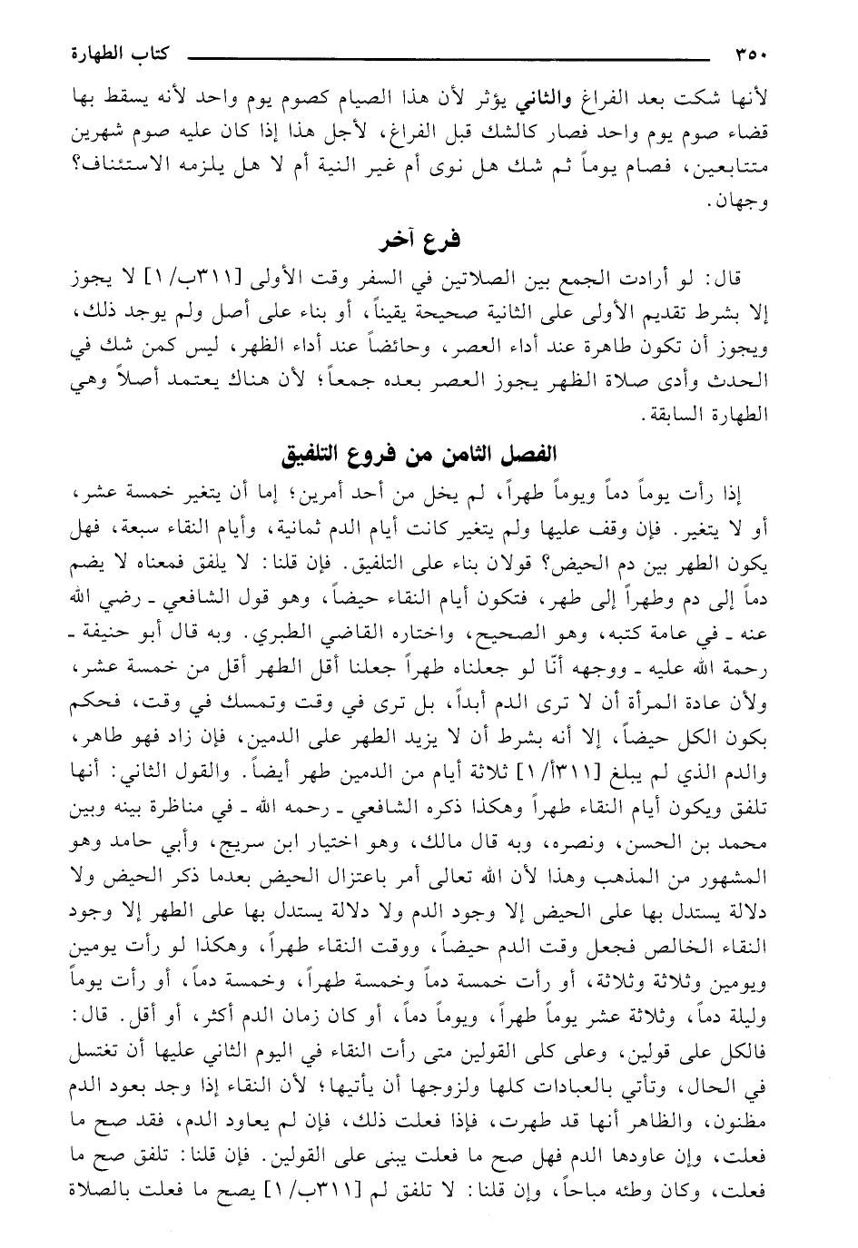 قال: لو أرادت الجمع بين الصلاتين في السفر وفت الأولى (311 أ/ 1) لا يجوز إلا بشرط تقديم الأولى على الثانية صحيحة يقيناً، أو بناء على أصل ولم يوجد ذلك، ويجوز أن تكون طاهرة عند أداء العصر، وحائضاً عند أداء الظهر، ليس كمن شك في الحدث وأدى صلاة الظهر يجوز العصر بعده جمعاً، لأن هناك يعتمد أصلاً وهي الطهارة السابقة.