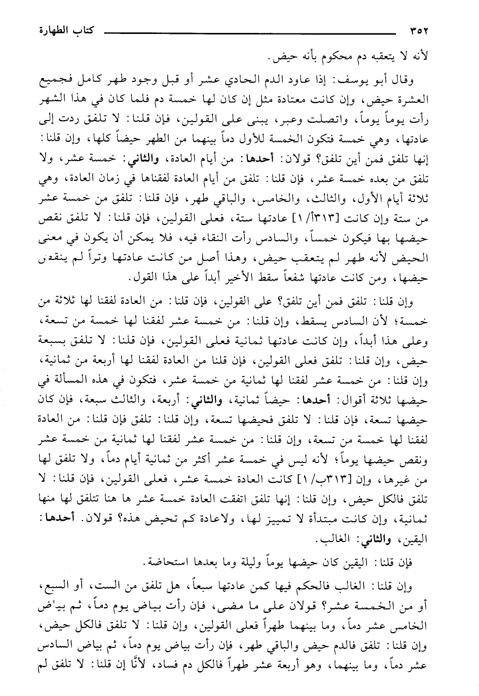 وقال أبو يوسف: إذا عاود الدم الحادي عشر أو قبل وجود طهر كامل فجميع العشرة حيض، وإن كانت معتادة مثل إن كان لها خمسة دم فلما كان في هذا الشهر رأت يوماً يوماً، واتصلت وعبر، يبني على القولين، فإن قلنا: لا تلفق ردت إلى عادتها، وهي خمسة فتكون الخمسة للأول دماً بينهما من الطهر حيضاً كلها، وإن قلنا: إنها تلفق فمن أين تلفق؟ قولان: أحدها: من أيام العادة، والثاني: خمسة عشر، ولا تلفق من بعده خمسة عشر، فإن قلنا: تلفق من أيام العادة لفقناها في زمان العادة، وهي ثلاثة أيام الأول، والثالث، والخامس، والباقي طهر، فإن قلنا: نلفق من خمسة عشر من ستة وإن كانت (313 ب/ 1) عادتها ستة، فعلى القولين، فإن قلنا: لا تلفق نقص حيضها بها فيكون خمساً، والسادس رأت النقاء فيه،