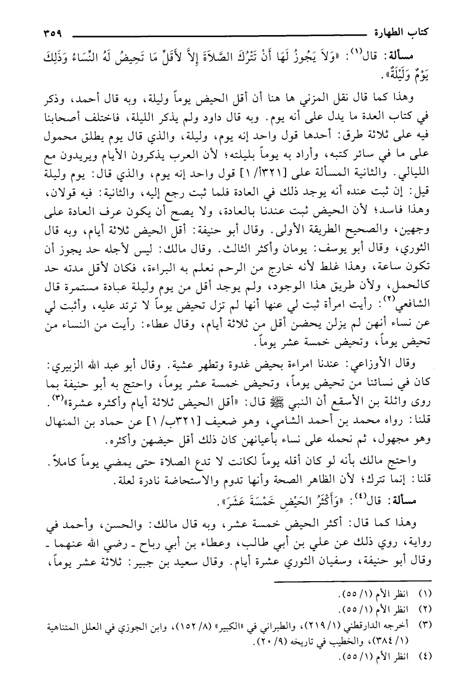 ,قال الأوزاعي: عندنا امرأة بحيض غدوةً وتطهر عشيةً. وقال "أبو عبد الله الزبيري": كان في نسائنا من تحيض يومًا وتحيض خمسةَ عشر يومًا، واحتج به أبو حنيفة بما رؤى "وائلة بن الأسقع" أن النبي. صلى الله عليه وسلم قال:"اقل الحيض ثلاثةً أيام وأكثره عشرة". قلنا: رواه محمد بن أحمد الشامي، وهو وضعيف [321 ا/1] عن "حماد ابن المنهال" وهو مجهول، ثم نحمله على نساء بأعيانهن كان ذلك أقل حيضهن وأكثره. واحتج مالك بأنه لو كان أقله يومًا لكانت لا تقع الصلاةَ حتى يمضي يومًا كاملًا.