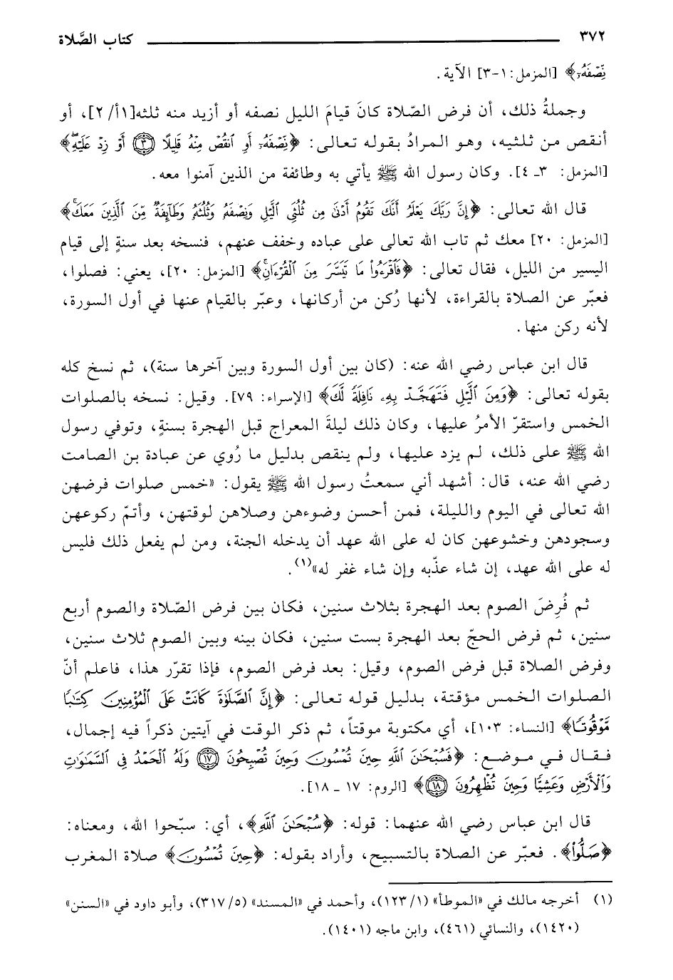 وجملة ذلك، أن فرض الصلاة كان قيام الليل نصفه أو أزيد منه ثلثه [1 أ/2]، أو أنقص من ثلثيه، وهو المراد بقوله تعالى: "نصفه أو انقص منه قليلا أو زد عليه" [المزمل: 3 - 4]. وكان رسول الله صلى الله عليه وسلم يأتي به وطائفة من الذين آمنوا معه.