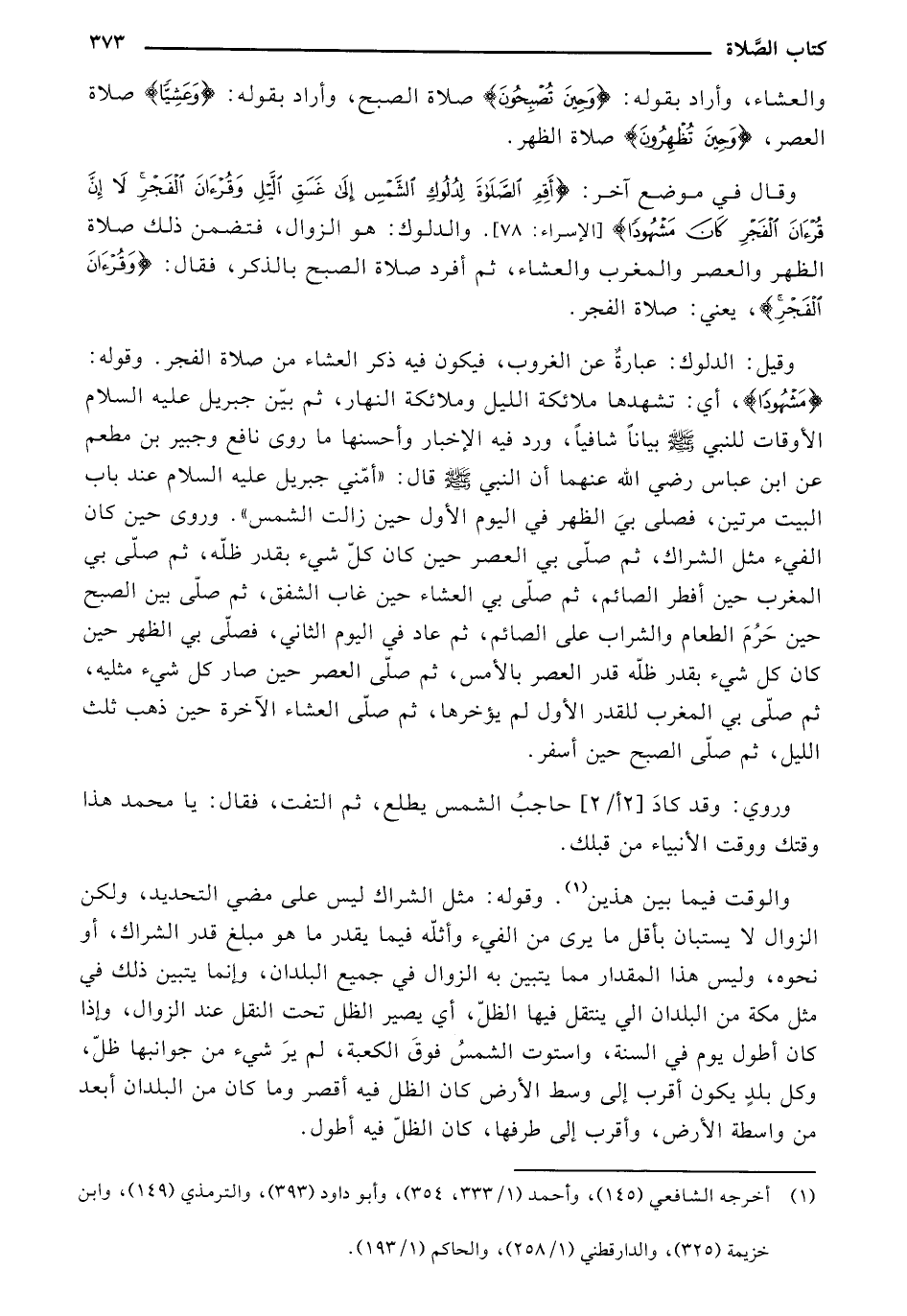 وقيل: الدلوك: عبارة عن الغروب، فيكون فيه ذكر العشاء من صلاة الفجر. وقوله: "مشهودا"، أي: تشهدها ملائكة الليل وملائكة النهار، ثم بين جبريل عليه السلام الأوقات للنبي صلى الله عليه وسلم بيانا شافيا، ورد فيه الإخبار وأحسنها ما روى نافع وجبير بن مطعم عن ابن عباس رضي الله عنهما أن النبي صلى الله عليه وسلم قال: "أمني جبريل عليه السلام عند باب البيت مرتين، فصلى بي الظهر في اليوم الأول حين زالت الشمس ". وروى حين كان الفيء مثل الشراك، ثم صلى بي العصر حين كان كل شيء بقدر ظله، ثم صلى بي المغرب حين أفطر الصائم، ثم صلى بي العشاء حين غاب الشفق، ثم صلى بين الصبح حين حرم الطعام والشراب على الصائم، ثم عاد في اليوم الثاني، فصلى بي الظهر حين كان كل شيء بقدر ظله قدر العصر بالأمس، ثم صلى العصر حين صار كل شيء مثليه، ثم صلى بي المغرب للقدر الأول لم يؤخرها، ثم صلى العشاء الآخرة حين ذهب ثلث الليل، ثم صلى الصبح حين أسفر.