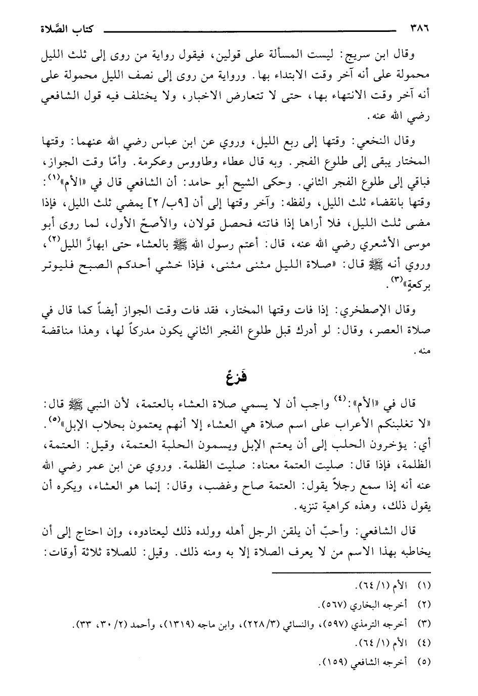 قال في «الأم»: واجب أن لا يسمي صلاة العشاء بالعتمة، لأن النبي صلى الله عليه وسلم قال: «لا تغلبنكم الأعراب على اسم صلاة هي العشاء إلا أنهم يعتمون بحلاب الإبل». أي: يؤخرون الحلب إلى أن يعتم الإبل ويسمون الحلبة العتمة، وقيل: العتمة، الظلمة، فإذا قال: صليت العتمة معناه: صليت الظلمة. وروي عن ابن عمر رضي الله عنه أنه إذا سمع رجلاً يقول: العتمة صاح وغضب، وقال: إنما هو العشاء، ويكره أن يقول ذلك، وهذه كراهية تنزيه.