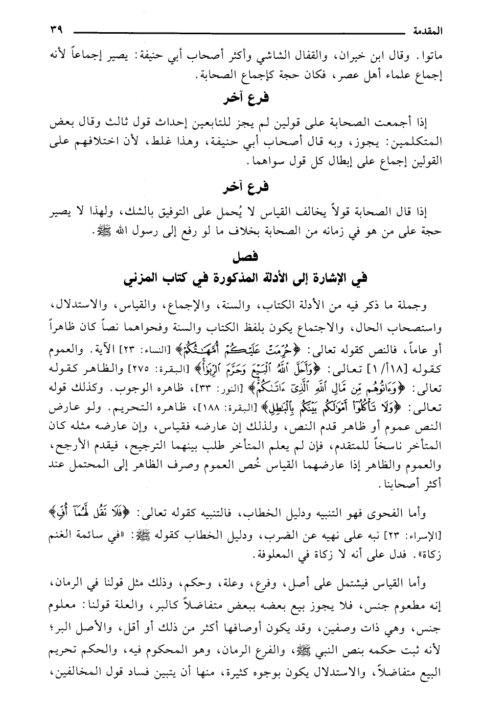وجملة ما ذكر فيه من الأدلة الكتاب، والسنة، والإجماع، والقياس، والاستدلال، واستصحاب الحال، والاجتماع يكون بلفظ الكتاب والسنة وفحواهما نصًا كان ظاهرًا أو عامًا، فالنص كقوله تعالى: {حُرِّمَتْ عَلَيْكُمْ أُمَّهَاتُكُمْ} [النساء: 23] الآية. والعموم كقوله [18 أ/ 1] تعالى: {وَأَحَلَّ اللَّهُ الْبَيْعَ وَحَرَّمَ الرِّبَا} [البقرة: 275] والظاهر كقوله تعالى: {وَآَتُوهُمْ مِنْ مَالِ اللَّهِ الَّذِي آَتَاكُمْ} [النور: 33]، ظاهرة الوجوب. وكذلك قوله تعالى: {وَلَا تَاكُلُوا أَمْوَالَكُمْ بَيْنَكُمْ بِالْبَاطِلِ} [البقرة: 188]، ظاهره كتحريم. ولو عارض النص عموم أو ظاهر قدم النص، ولذلك إن عارضه فقياس، وإن عارضه مثله كان المتأخر ناسخًا للمتقدم، فإن لم يعلم المتأخر طلب بينهما الترجيح، فيقدم الأرجح، والعموم والظاهر إذا عارضهما القياس خُص العموم وصرف الظاهر إلى المحتمل عند أكثر أصحابنا.