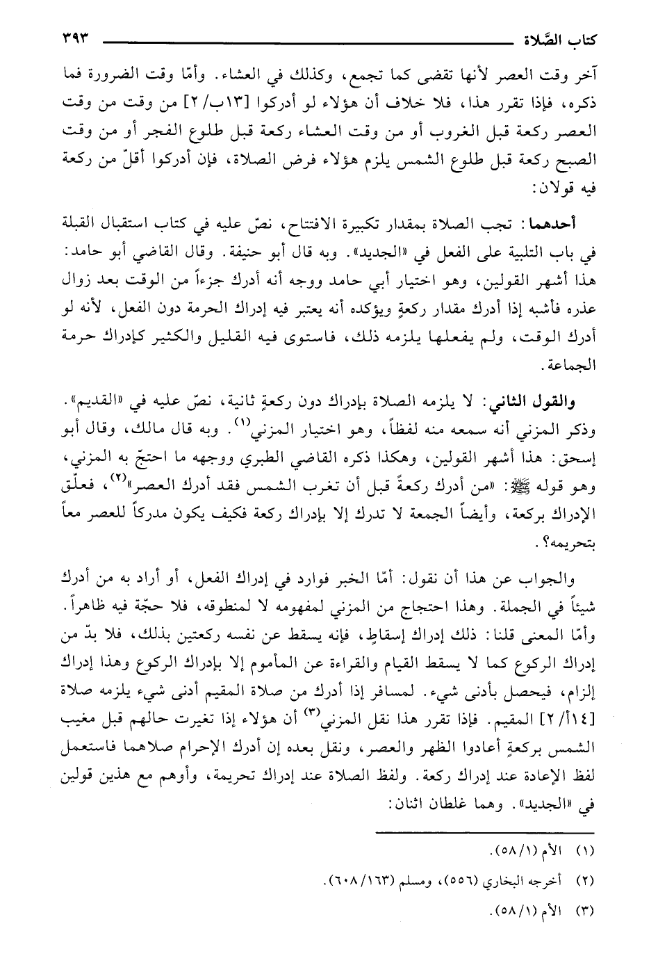 والجواب عن هذا أن نقول: أما الخبر فوارد في إدراك الفعل، أو أراد به من أدرك شيئاً في الجملة. وهذا احتجاج من المزني لمفهومه لا لمنطوقه، فلا حجة فيه ظاهراً. وأما المعنى قلنا: ذلك إدراك إسقاط، فإنه يسقط عن نفسه ركعتين بذلك، فلا بدَّ من إدراك الركوع كما لا يسقط القيام والقراءة عن المأموم إلا بإدراك الركوع وهذا إدراك إلزام، فيحصل بأدنى شيء. لمسافر إذا أدرك من صلاة المقيم أدنى شيء يلزمه صلاة [14 أ/ 2] المقيم. فإذا تقرر هذا نقل المزني أن هؤلاء إذا تغيرت حالهم قبل مغيب الشمس بركعة أعادوا الظهر والعصر، ونقل بعده إن أدرك الإحرام صلاهما فاستعمل لفظ الإعادة عند إدراك ركعة. ولفظ الصلاة عند إدراك تحريمة، وأوهم مع هذين قولين في «الجديد». وهما غلطان اثنان: