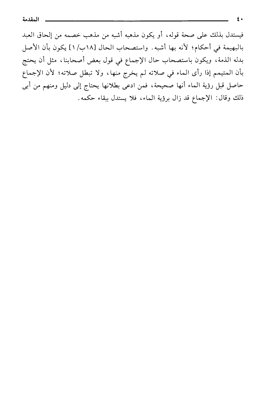 فيستدل بذلك على صحة قوله، أو يكون مذهبه أشبه من مذهب خصمه من إلحاق العبد بالبهيمة في أحكام؛ لأنه بها أشبه. واستصحاب الحال [18 ب/ 1] يكون بأن الأصل بدله الذمة، ويكون باستصحاب حال الإجماع في قول بعض أصحابنا، مثل أن يحتج بأن المتيمم إذا رأى الماء في صلاته لم يخرج منها، ولا تبطل صلاته؛ لأن الإجماع حاصل قبل رؤية الماء أنها صحيحة، فمن ادعى بطلانها يحتاج إلى دليل ومنهم من أبى ذلك وقال: الإجماع قد زال برؤية الماء، فلا يستدل ببقاء حكمه.