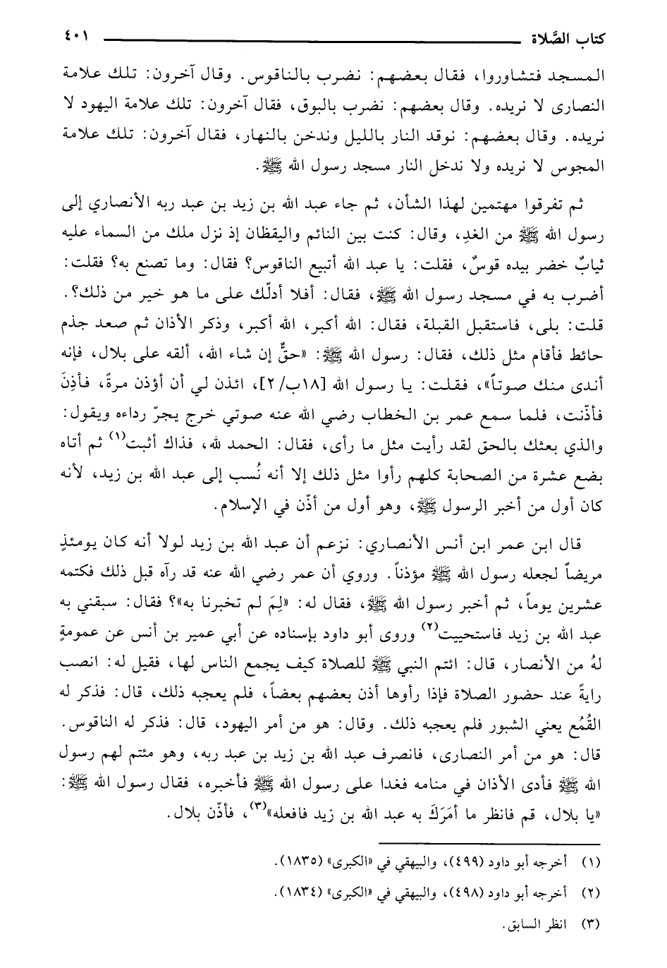 قال ابن عمر ابن أنس الأنصاري: نزعم أن عبد الله بن زيد لولا أنه كان يومئذٍ مريضاً لجعله رسول الله صلى الله عليه وسلم مؤذناً. وروي أن عمر رضي الله عنه قد رآه قبل ذلك فكتمه عشرين يوماً، ثم أخبر رسول الله صلى الله عليه وسلم، فقال له: «لم لم تخبرنا به؟» فقال: سبقني به عبد الله بن زيد فاستحييت وروى أبو داود بإسناده عن أبي عمير بن أنس عن عمومة له من الأنصار، قال: ائتم النبي صلى الله عليه وسلم للصلاة كيف يجمع الناس لها، فقيل له: انصب راية عند حضور الصلاة فإذا رأوها أذن بعضهم بعضاً، فلم يعجبه ذلك، قال: فذكر له القمع يعني الشبور فلم يعجبه ذلك. وقال: هو من أمر اليهود، قال: فذكر له الناقوس. قال: هو من أمر النصارى، فانصرف عبد الله بن زيد بن عبد ربه، وهو (مهتم) لهم رسول الله صلى الله عليه وسلم فأدى الأذان في منامه فغدا على رسول الله صلى الله عليه وسلم فأخبره، فقال رسول الله صلى الله عليه وسلم: «يا بلال، قم فانظر ما أمرك به عبد الله بن زيد فافعله»، فأذن بلال.