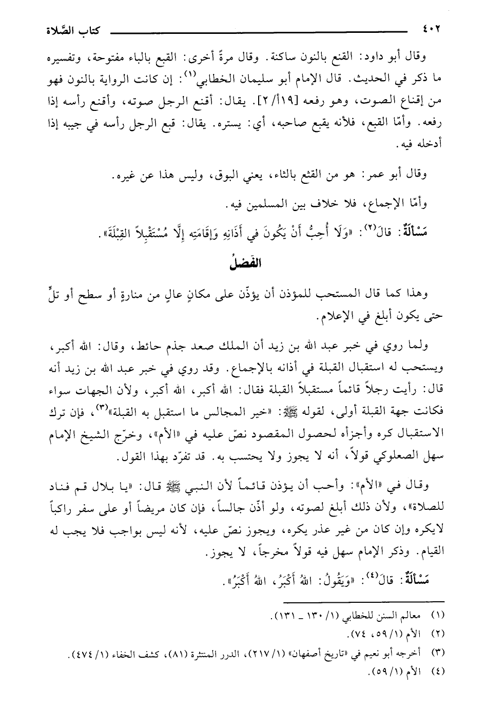 ولما روي في خبر عبد الله بن زيد أن الملك صعد جذم حائط، وقال: الله أكبر، ويستحب له استقبال القبلة في أذانه بالإجماع. وقد روي في خبر عبد الله بن زيد أنه قال: رأيت رجلاً قائماً مستقبلاً القبلة فقال: الله أكبر، الله أكبر، ولأن الجهات سواء فكانت جهة القبلة أولى، لقوله صلى الله عليه وسلم: «خير المجالس ما استقبل به القبلة»، فإن ترك الاستقبال كره وأجزأه لحصول المقصود نص عليه في «الأم»، وخرج الشيخ الإمام سهل الصعلوكي قولاً، أنه لا يجوز ولا يحتسب به. قد تفرَّد بهذا القول.