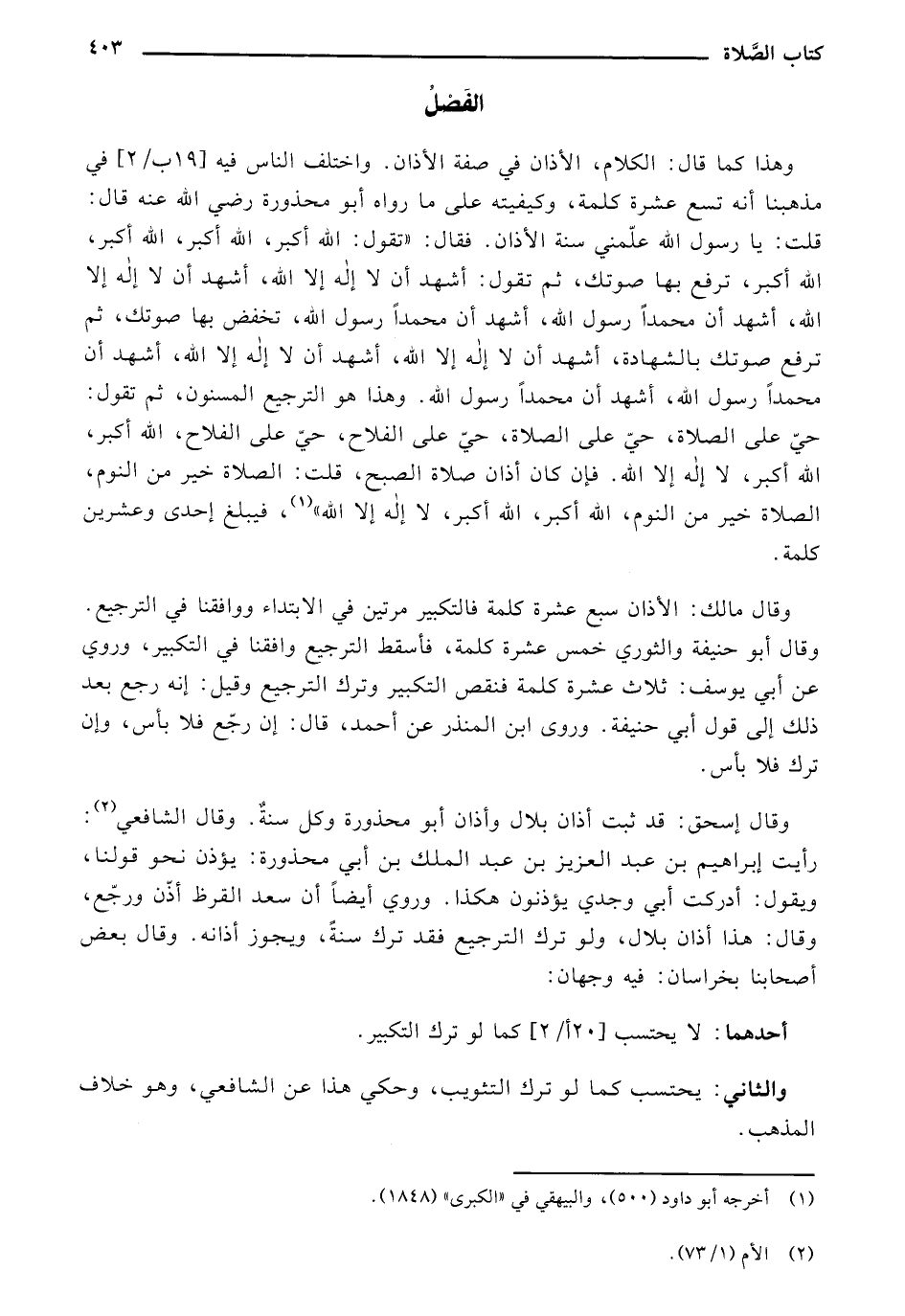 وهذا كما قال: الكلام، الأذان في صفة الأذان. واختلف الناس فيه [19 ب/ 2]، في مذهبنا أنه تسع عشرة كلمة، وكيفيته على ما رواه أبو محذورة رضي الله عنه قال: قلت: يا رسول الله علمني سنة الأذان. فقال: «تقول: الله أكبر، الله أكبر، الله أكبر، الله أكبر، ترفع بها صوتك، ثم تقول: أشهد أن لا إله إلا الله، أشهد أن لا إله إلا الله، أشهد أن محمداً رسول الله، أشهد أن محمداً رسول الله، تخفض بها صوتك، ثم ترفع صوتك بالشهادة، أشهد أن لا إله إلا الله، أشهد أن لا إله إلا الله، أشهد أن محمداً رسول الله، أشهد أن محمداً رسول الله. وهذا هو الترجيع المسنون، ثم تقول: حي على الصلاة، حي على الصلاة، حي على الفلاح، حي على الفلاح، الله أكبر، الله أكبر، لا إله إلا الله. فإن كان أذان صلاة الصبح، قلت: الصلاة خير من النوم، الصلاة خير من النوم، الله أكبر، الله أكبر، لا إله إلا الله»، فيبلغ إحدى وعشرين كلمة.