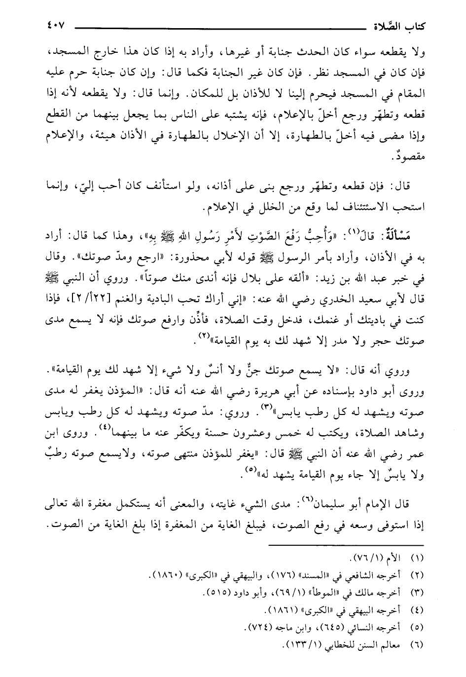 به في الأذان، وأراد بأمر الرسول صلى الله عليه وسلم قوله لأبي محذورة: «ارجع ومدَّ صوتك». وقال في خبر عبد الله بن زيد: «ألقه على بلال فإنه أندى منك صوتاً». وروي أن النبي صلى الله عليه وسلم قال لأبي سعيد الخدري رضي الله عنه: «إني أراك تحب البادية والغنم [22 أ/ 2]، فإذا كنت في باديتك أو غنمك، فدخل وقت الصلاة، فأذن وارفع صوتك فإنه لا يسمع مدى صوتك حجر ولا مدر إلا شهد لك به يوم القيامة».